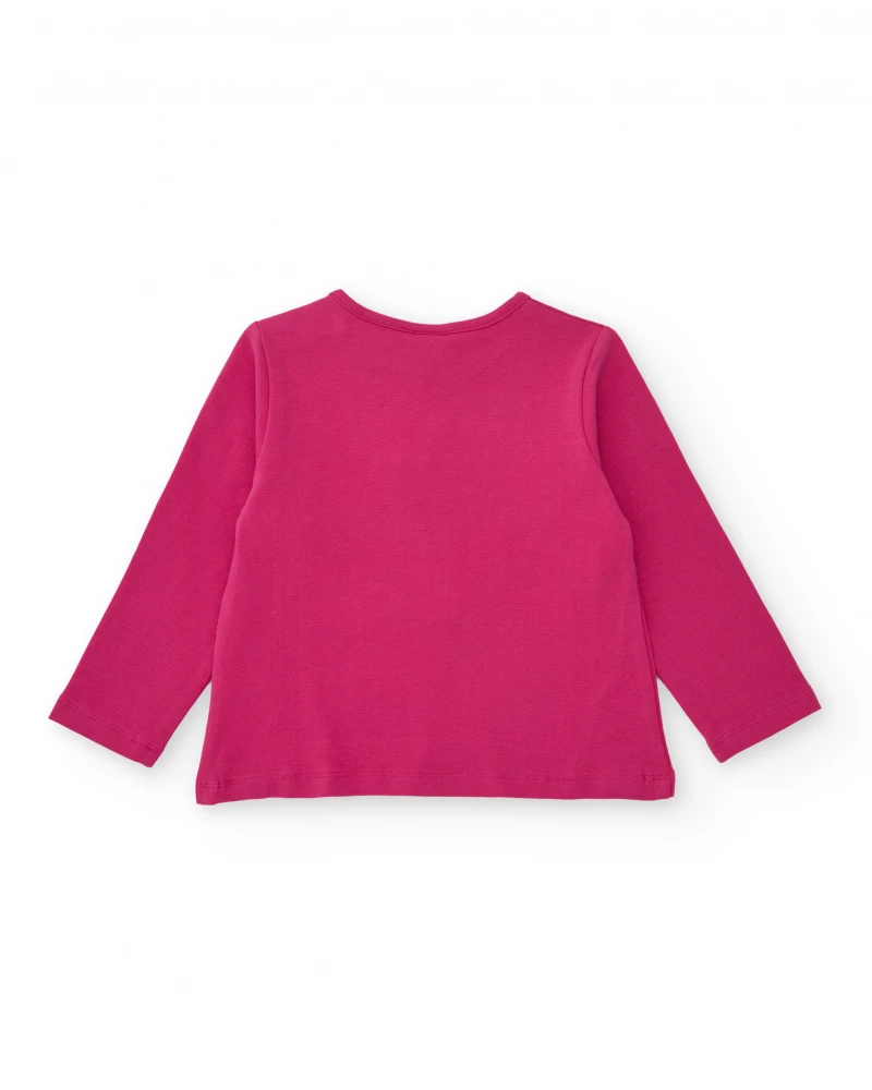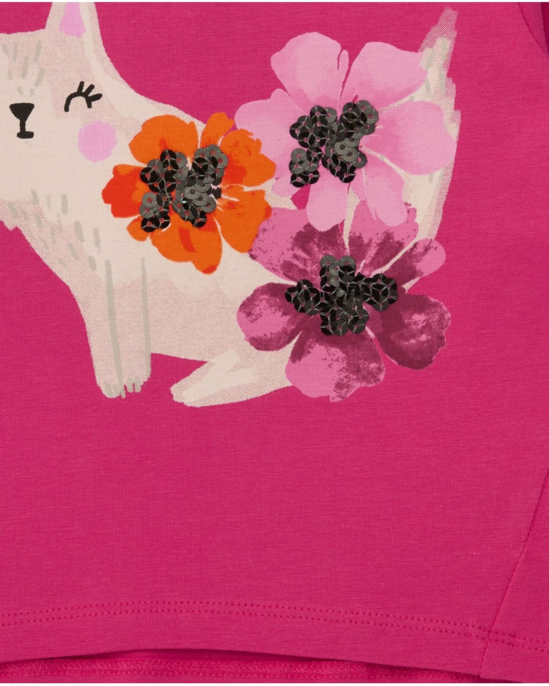 Maglietta a maniche lunghe da bambina in fucsia con disegno di un gatto decorato con fiori colorati. Chiusura a pressione sulla spalla per agevolare il cambio. Un modello comodo e originale per l’uso quotidiano.