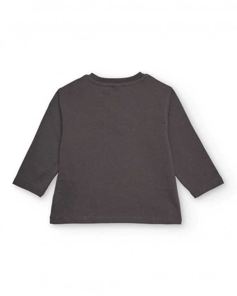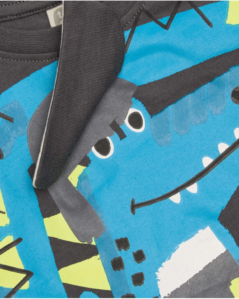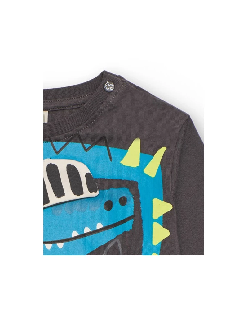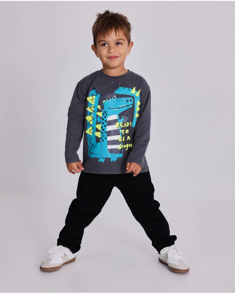 Maglietta a maniche lunghe per bambino in grigio scuro, realizzata in morbido jersey di cotone. Presenta una simpatica stampa frontale di drago blu con dettagli da cavaliere e la scritta “Ready to be a dragon”. Girocollo con bottoni automatici sulla spalla per una facile vestizione. Perfetta per aggiungere un tocco originale ai look di tutti i giorni.