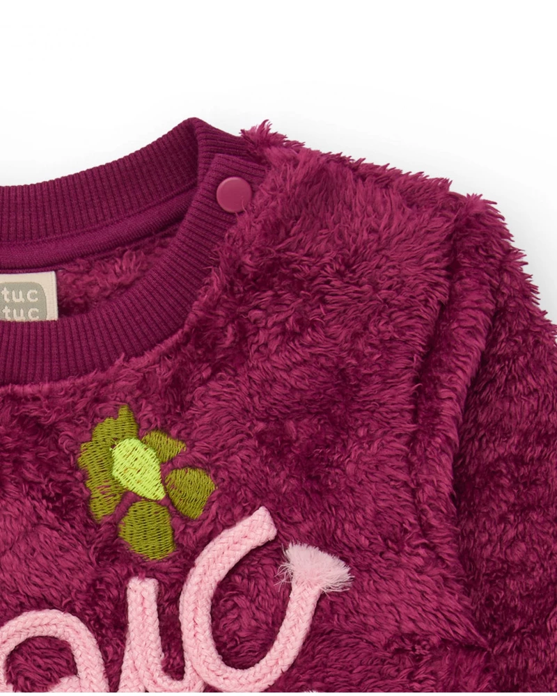 Felpa in tessuto peluche per bambina, con scollo rotondo e chiusura con bottone a pressione sulla spalla. Presenta una scritta โmagicโ ricamata in rilievo e piccoli motivi floreali. Un capo comodo e caldo, perfetto per le giornate fredde.