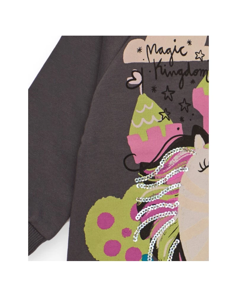 Vestito stile felpa per bambina in grigio scuro, con maniche lunghe e girocollo con bottone sulla spalla per facilitare la vestizione. Decorato sul davanti con una stampa colorata di unicorno, castello e arcobaleno, con dettagli di paillettes. Ideale per un look comodo, allegro e ricco di fantasia.