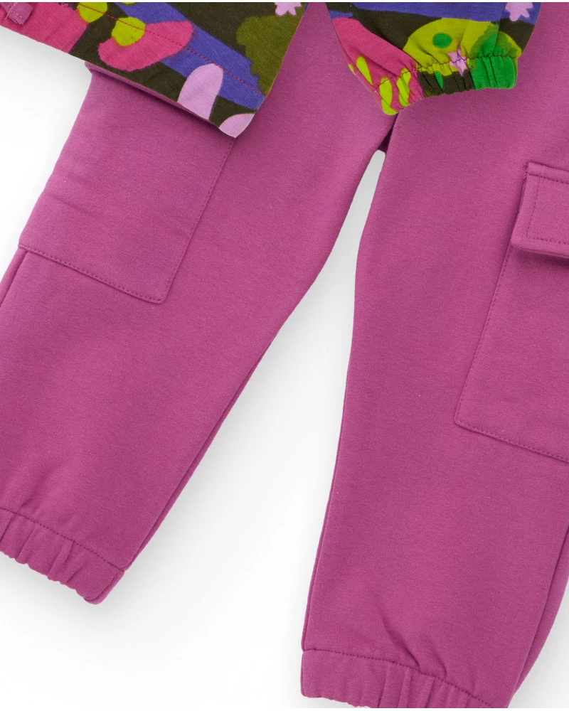 Completo per bambina composto da felpa a maniche lunghe con vivace stampa multicolore di motivi floreali e naturali, realizzata in morbido cotone per massimo comfort. Pantaloni jogger fucsia con pratiche tasche cargo e vita elasticizzata per una vestibilità perfetta.