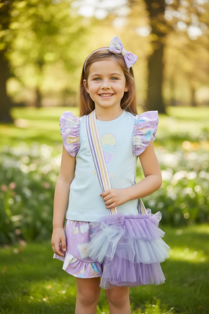 Borsa A Dee Bambina – Un sogno in tulle e colori pastello 💜🌈 Delicata, romantica e irresistibilmente chic. Questa meravigliosa borsa A Dee conquista con il suo design in tulle lilla arricchito da morbide balze e dettagli vaporosi che creano un effetto leggero e fiabesco. La tracolla a righe multicolor nei toni pastello aggiunge un tocco vivace e moderno, rendendola perfetta per completare outfit primaverili ed estivi con dolcezza e personalità. Un accessorio unico, pensato per piccole fashioniste che amano distinguersi con stile, fantasia e un pizzico di magia.