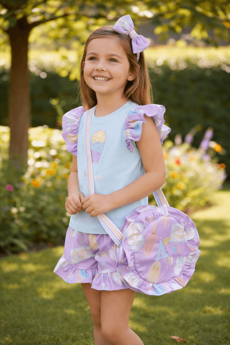 Una borsa semplicemente meravigliosa, firmata A Dee, pensata per aggiungere un tocco di magia a ogni outfit. Realizzata in tessuto leggero con deliziosa fantasia ice cream nei toni pastello del lilla, è arricchita da romantici volant che ne esaltano il design giocoso e raffinato.