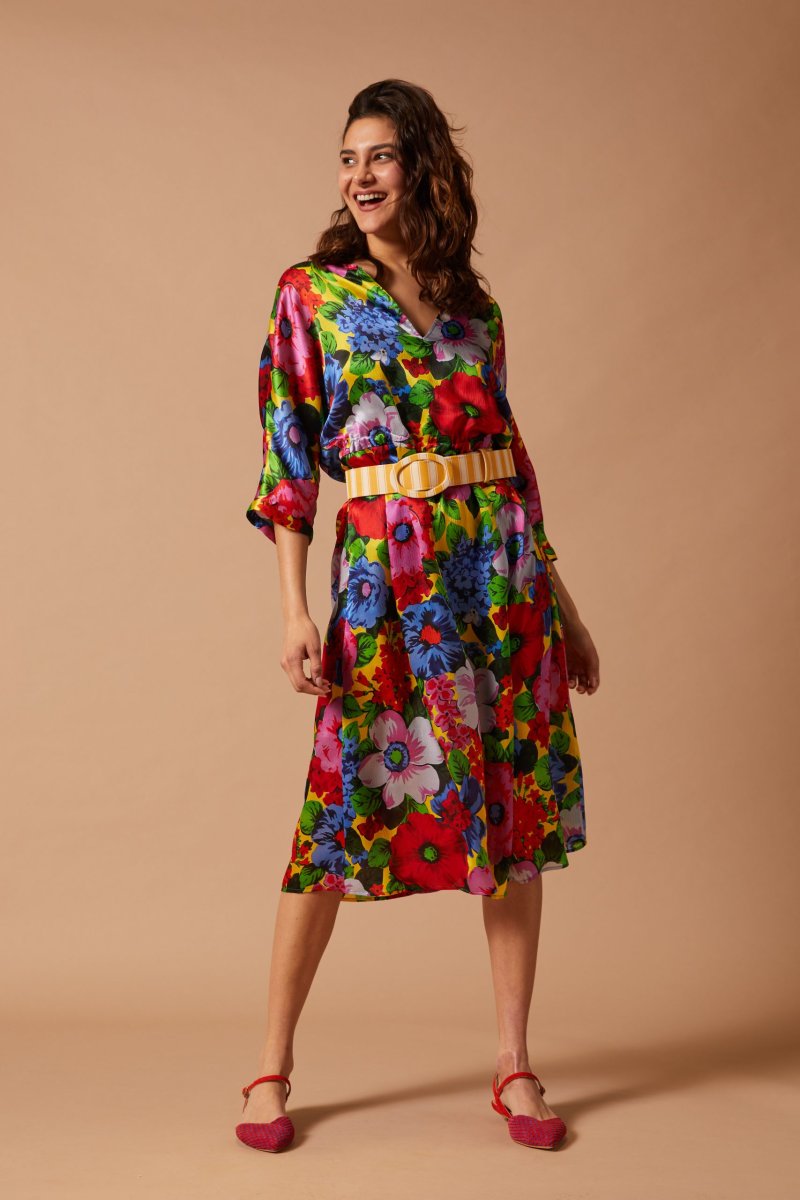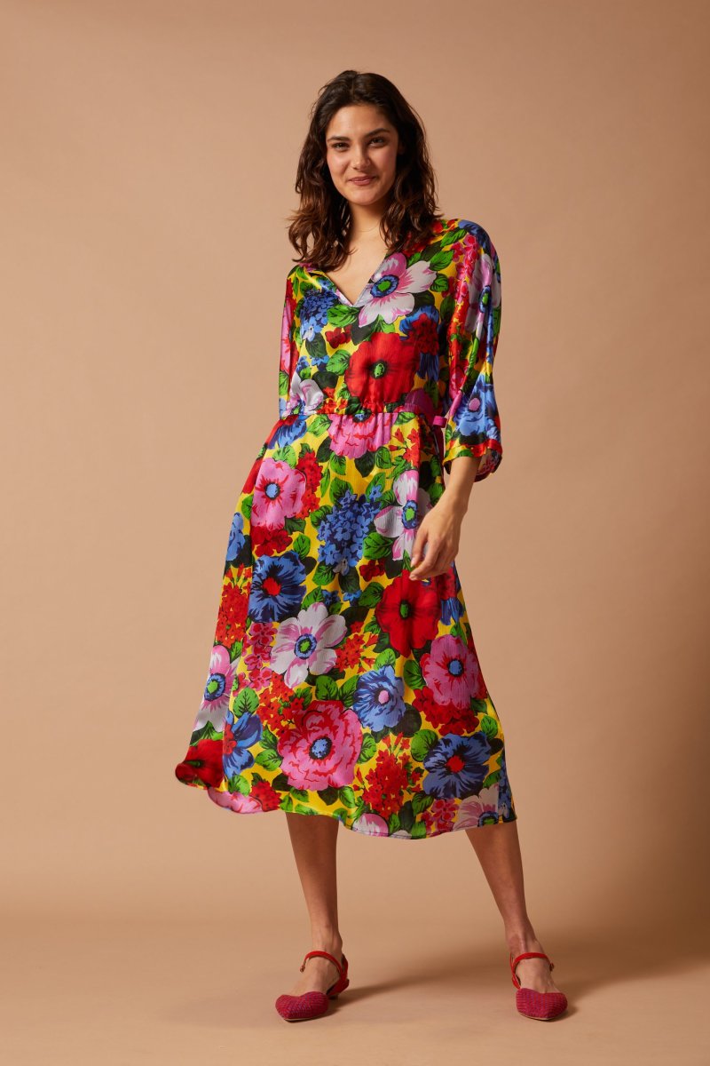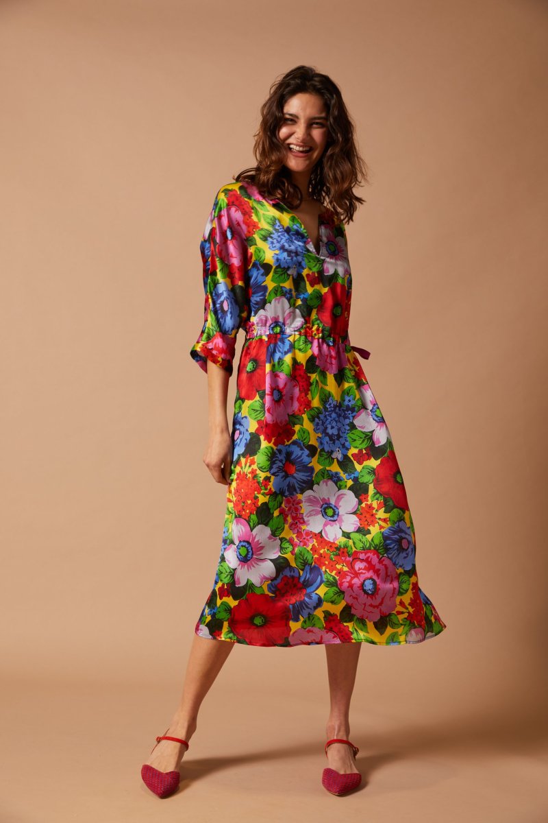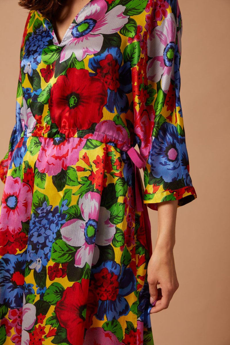 Abito Giada di Carla Saibeneย midi, in crepon satin con maxi fantasia a fiori blu rossi e verdi su fondo giallo. Scollatura a barchetta con taglio a V centrale e maniche al gomito a kimono. Ha una vestibilitร morbida, regolabile in vita da una coulisse con un nastro di gros grain. Vedi altre varianti 100% seta Made in Italy Scollo a barchetta con taglio centrale a V Coulisse regolabile in vita Maniche al gomito Vestibilitร morbida, la modella รจ alta 176 cm e indossa una 40