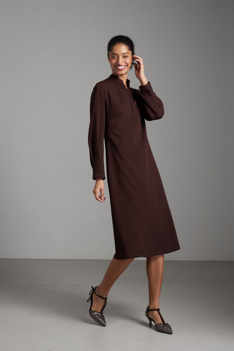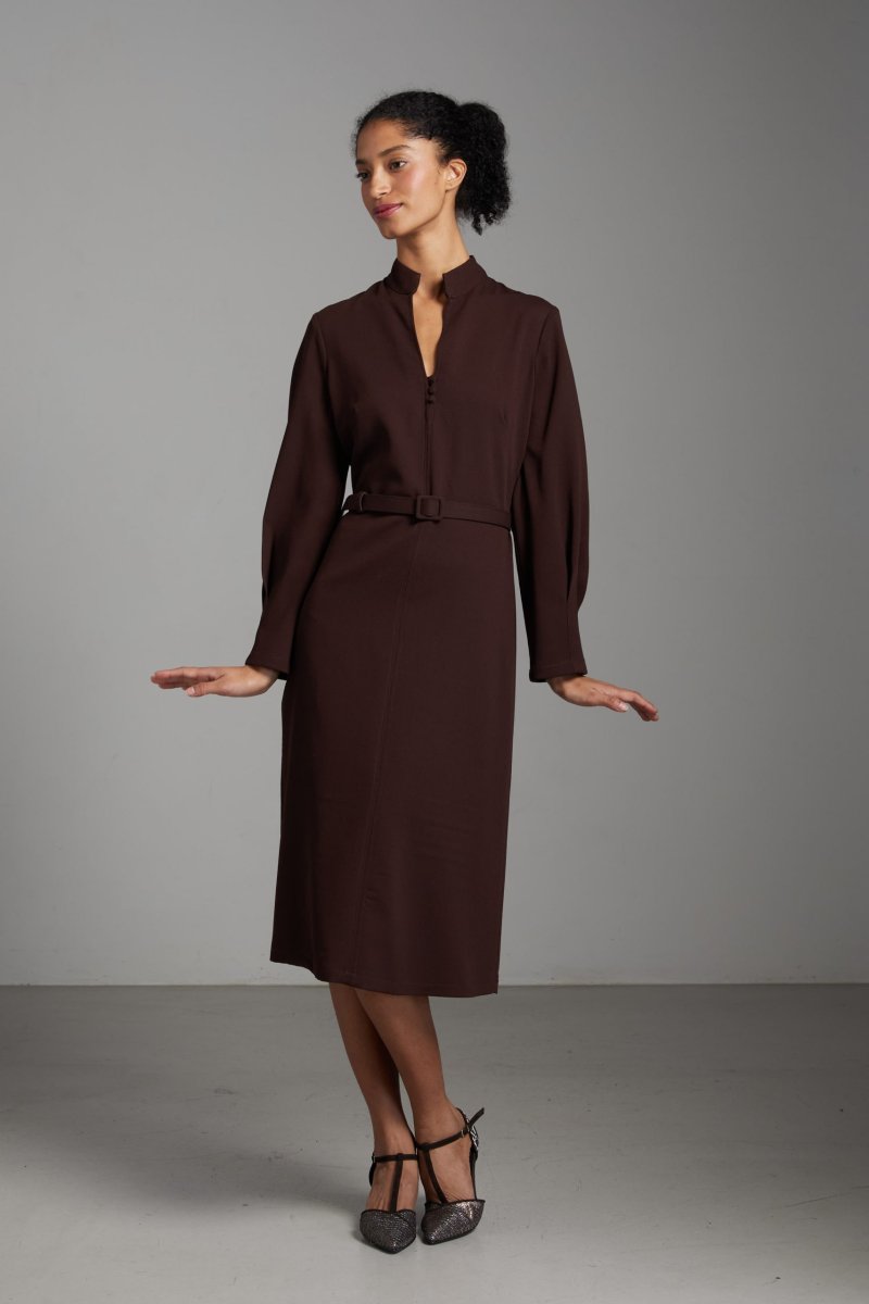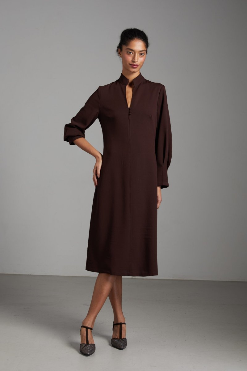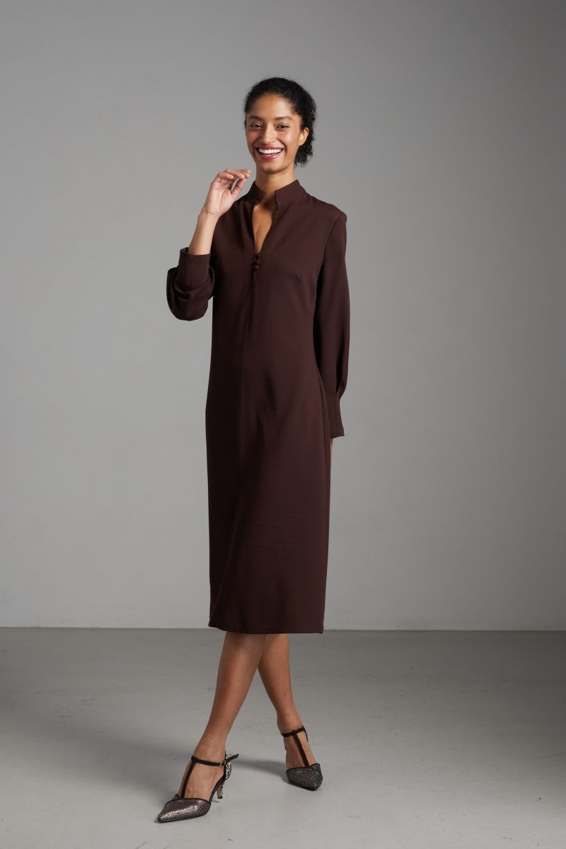 Abito Jasmine di Carla Saibene in crepe di lana marrone, longuette, collo alla coreana e scollo chiuso da tre bottoncini in tessuto, manica lunga tenuta da pieghe sul fondo. Vedi altre varianti 100% lana La cintura puรฒ essere acquistata separatamente Made in Italy Vestibilitร regolare: la modella indossa la taglia 40