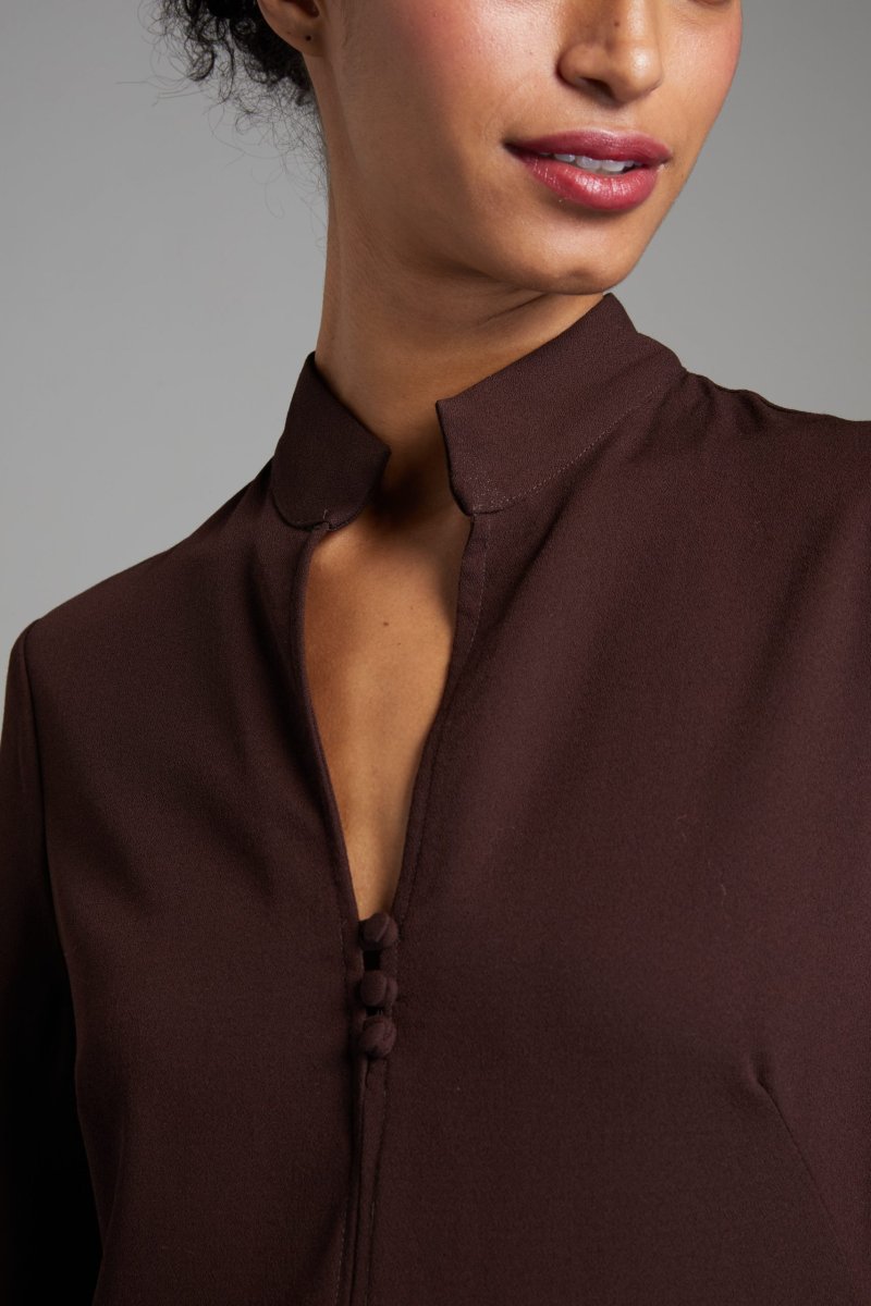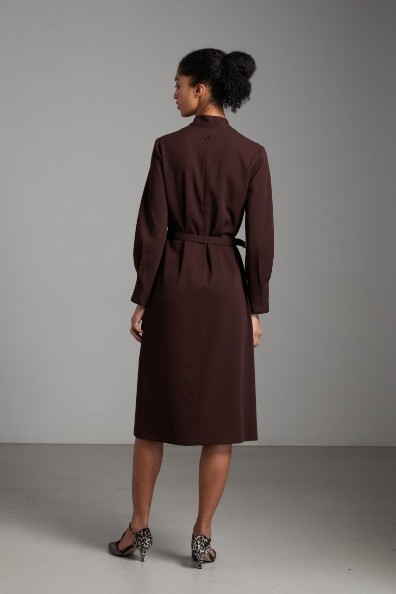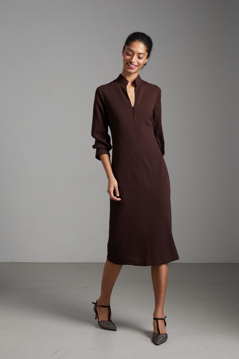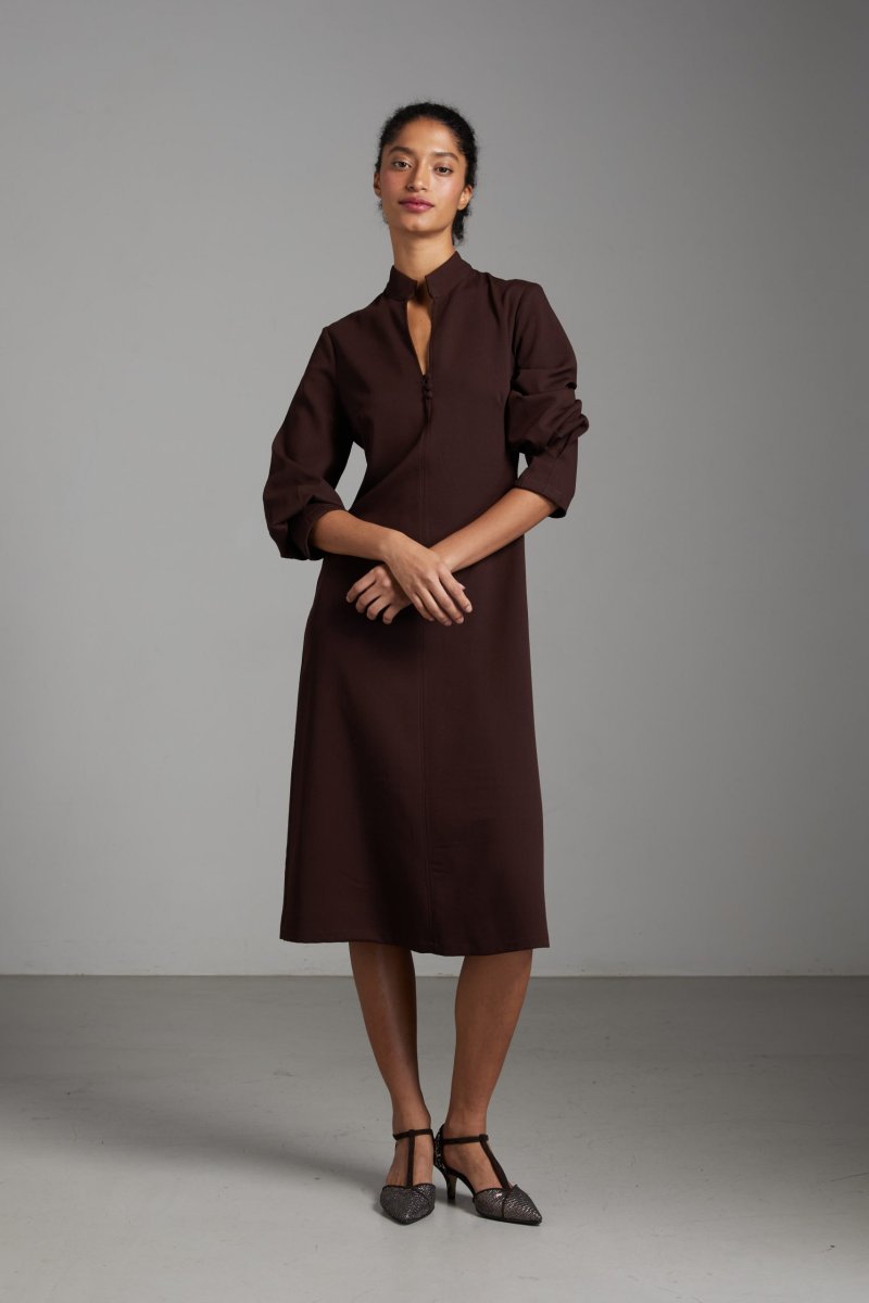 Abito Jasmine di Carla Saibene in crepe di lana marrone, longuette, collo alla coreana e scollo chiuso da tre bottoncini in tessuto, manica lunga tenuta da pieghe sul fondo. Vedi altre varianti 100% lana La cintura puรฒ essere acquistata separatamente Made in Italy Vestibilitร regolare: la modella indossa la taglia 40