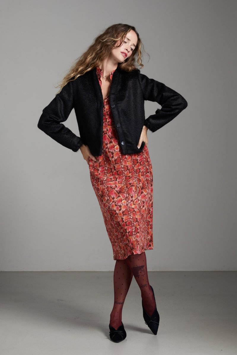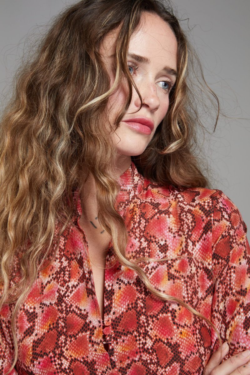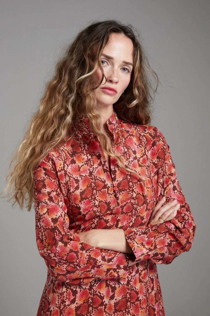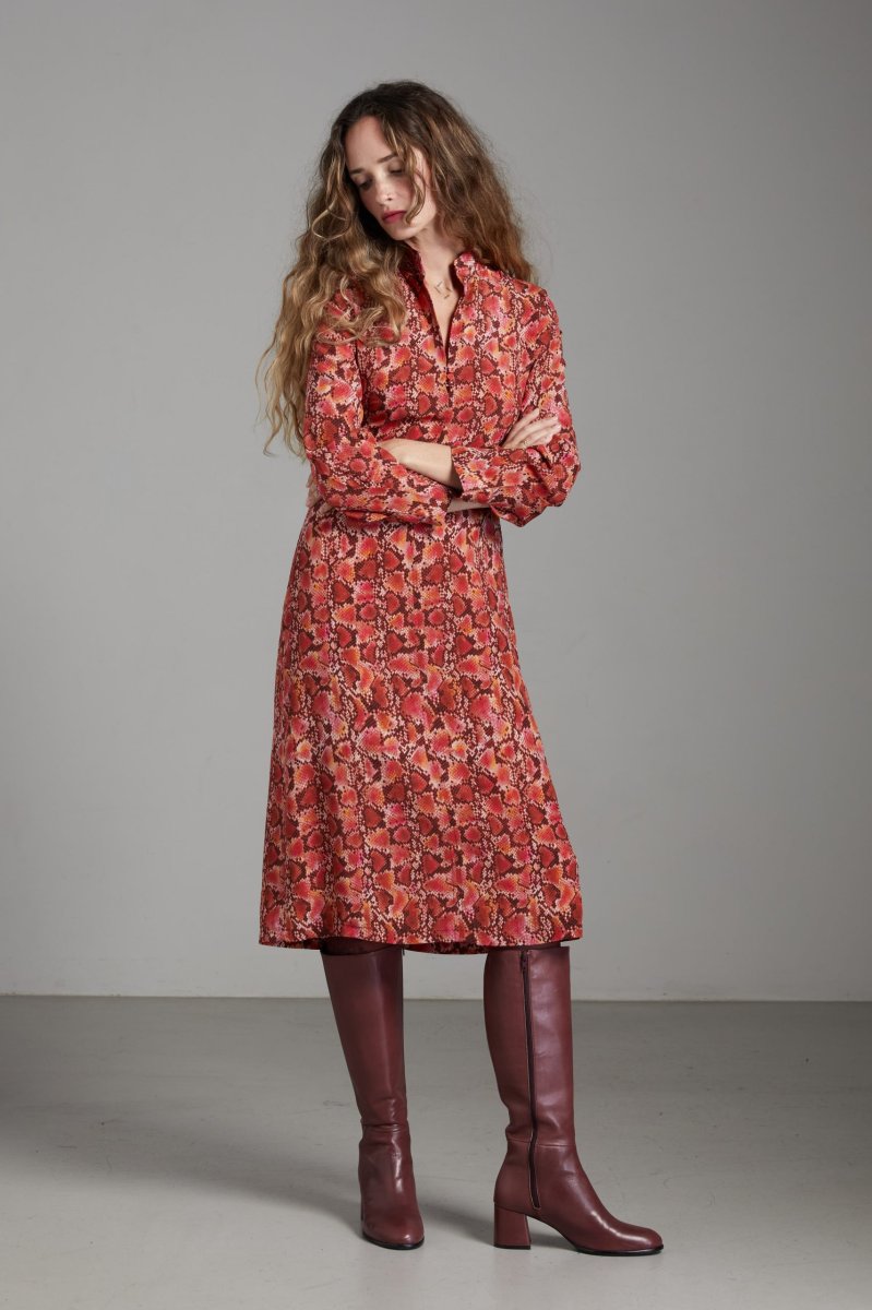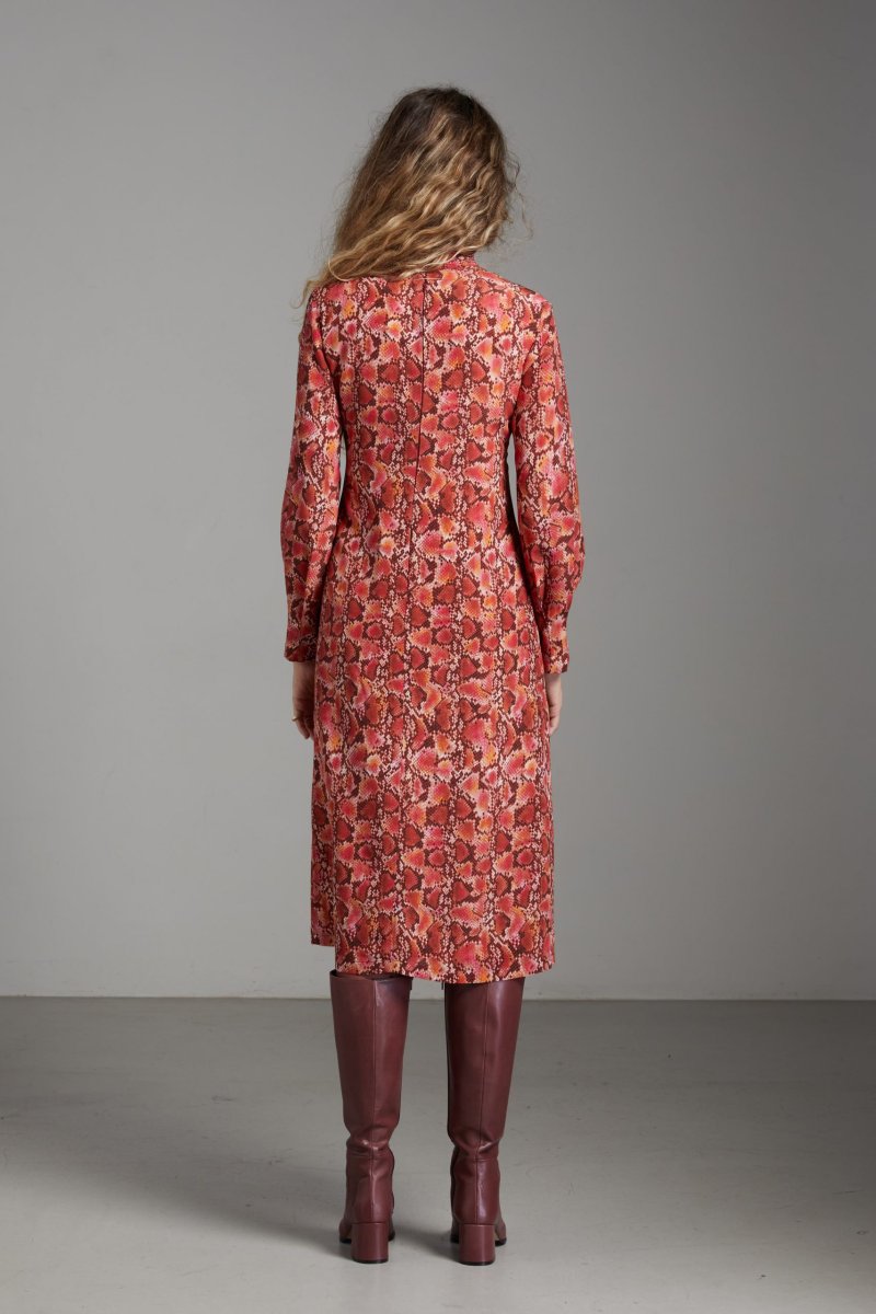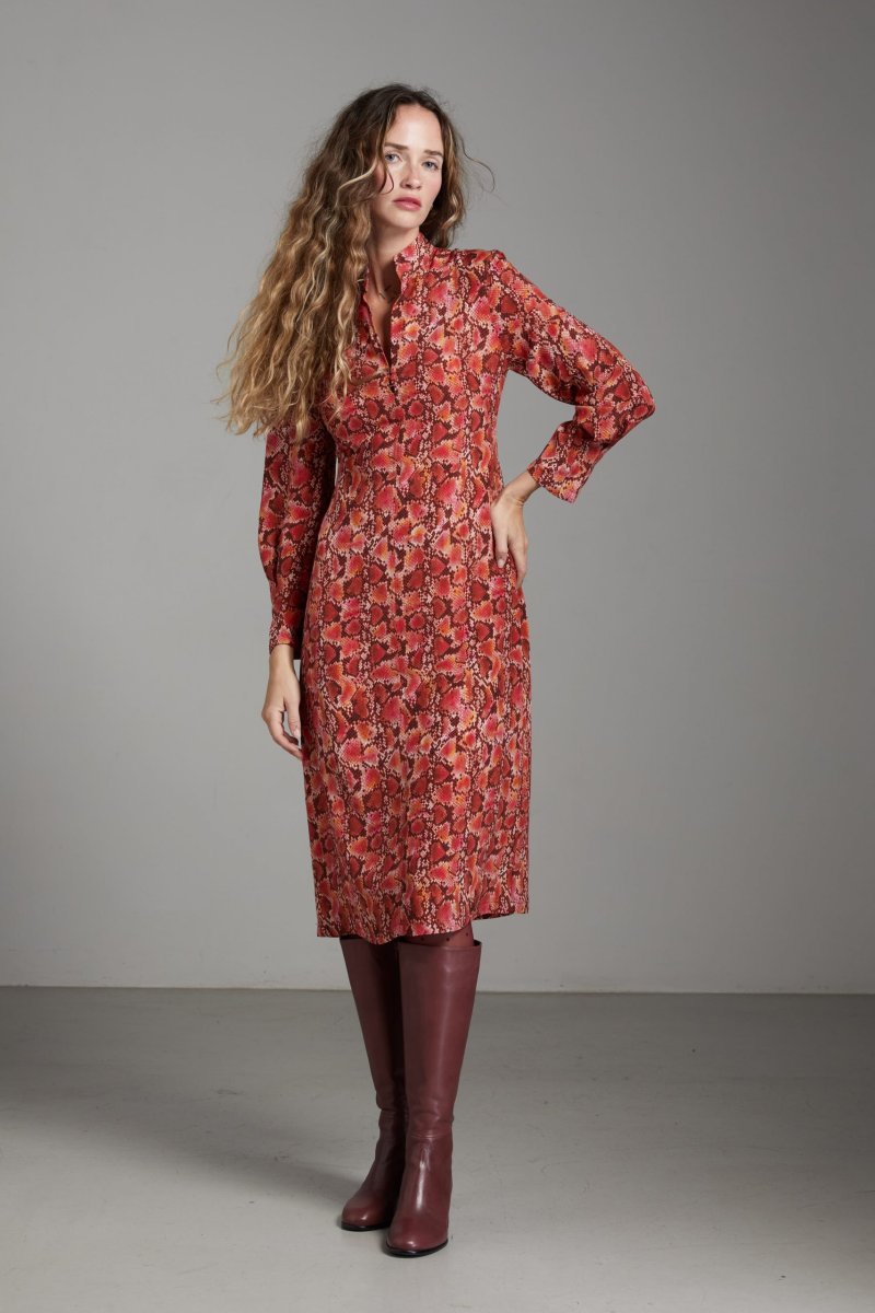 Abito Jasmine di Carla Saibene in seta rossa con stampa pitonata, longuette, collo alla coreana e scollo chiuso da tre bottoncini in tessuto, manica lunga tenuta da pieghe sul fondo. Vedi altre varianti 100% seta Made in Italy Vestibilitร regolare: la modella indossa la taglia 40