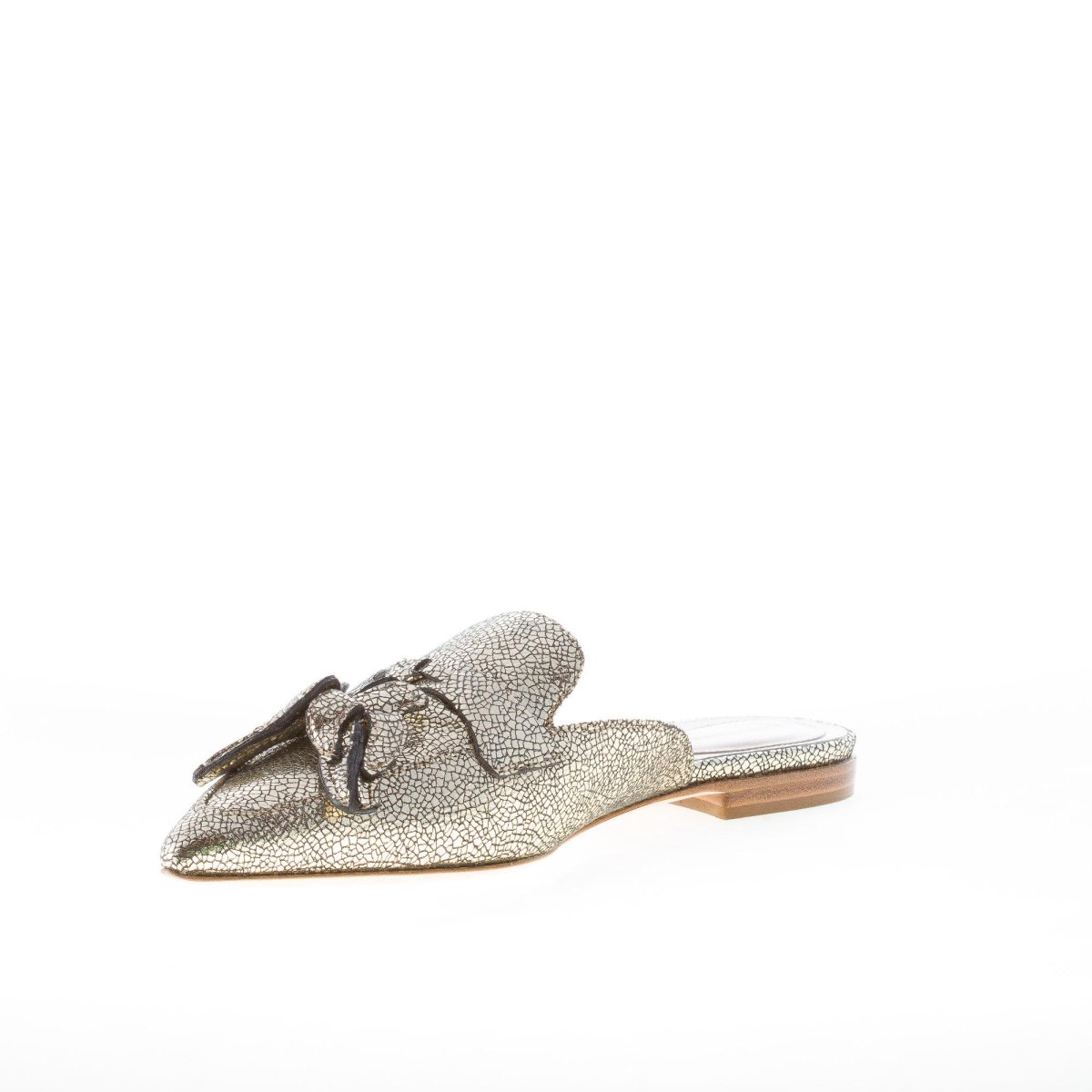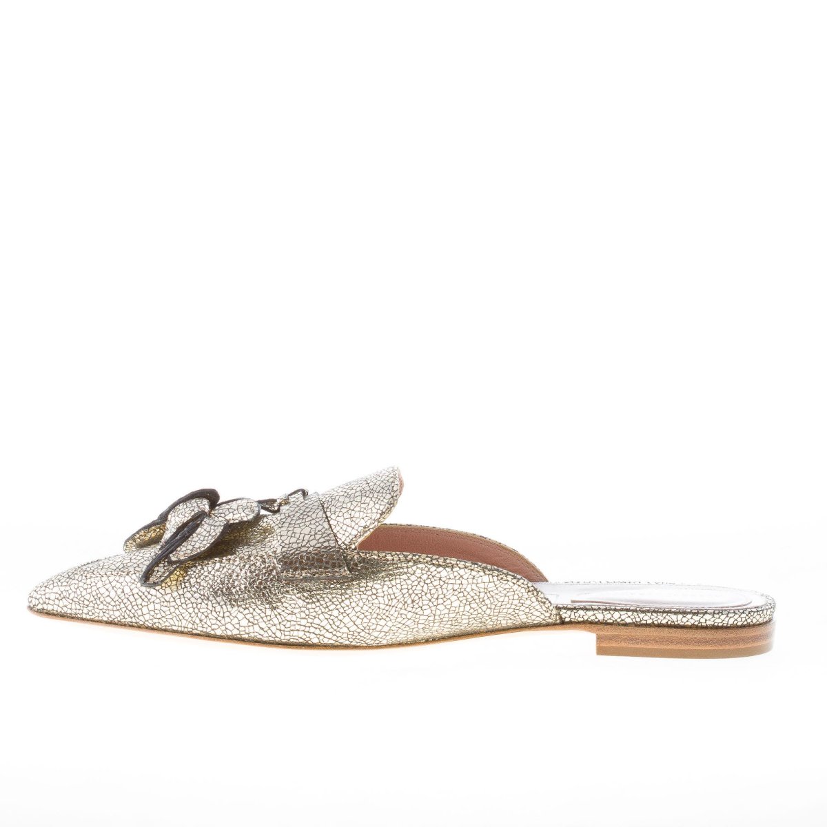 Mia mule featured in a golden-tone laminated leather with a luminous widespread craquelé effect. The mule is embellished with a banana charms detail. Leather sole
