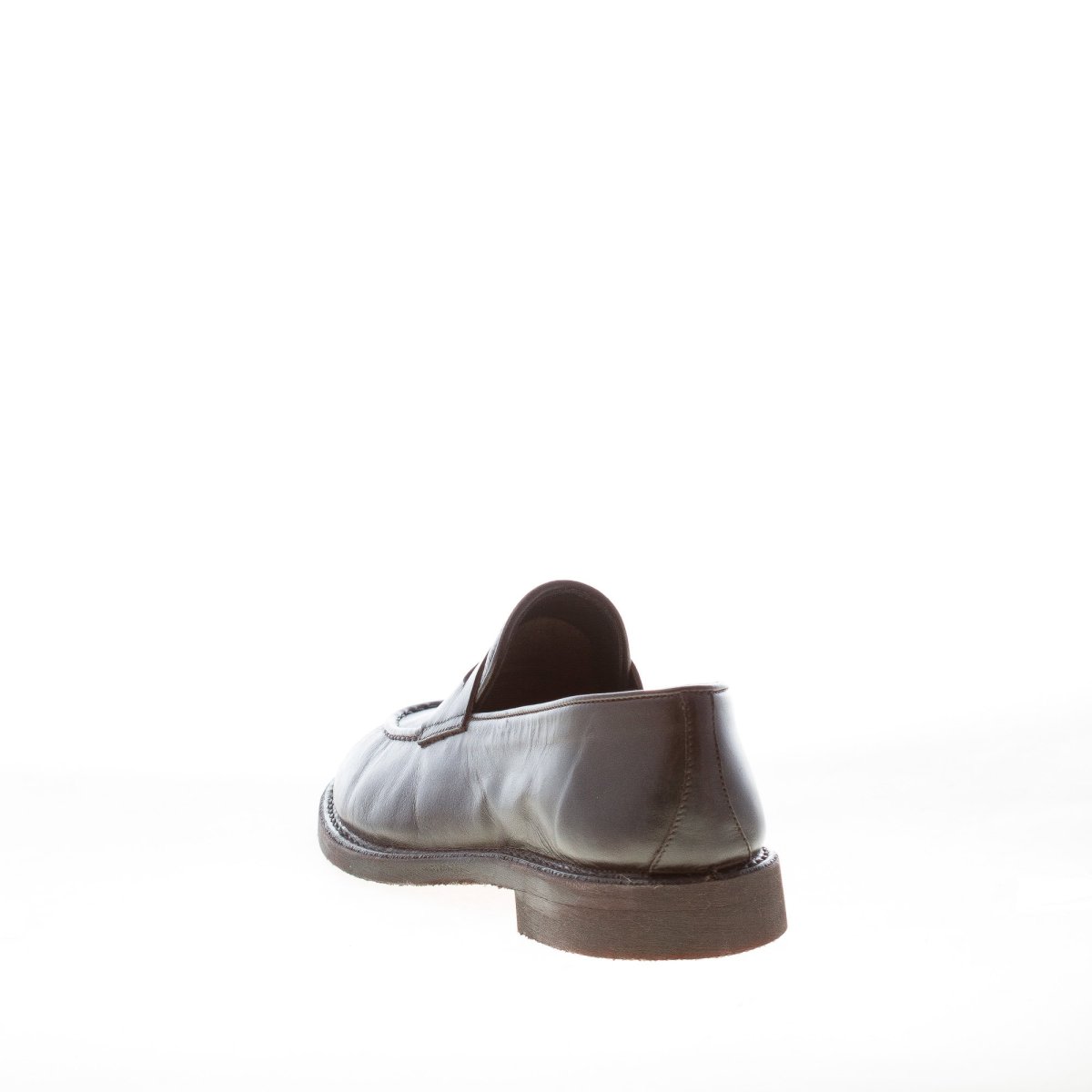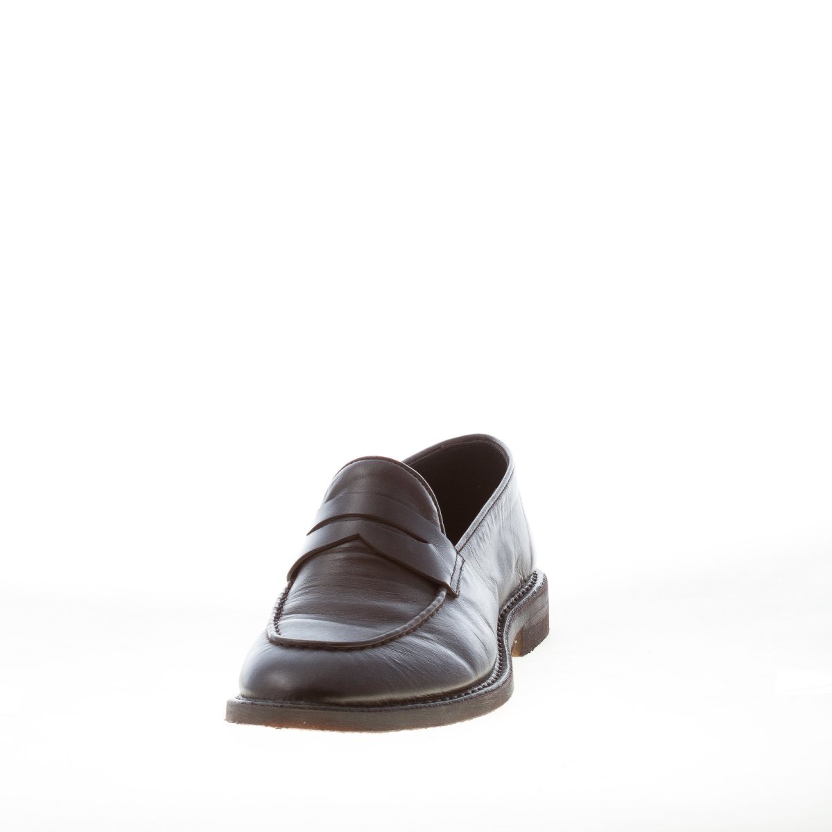 Mahogany brown fine napa leather Jason 94001 loafer, entirely handmade in Italy, with the classic front penny bar and the Adler stitching at toe. Exposed stitching on the welt. Ultra-flexible rubber sole