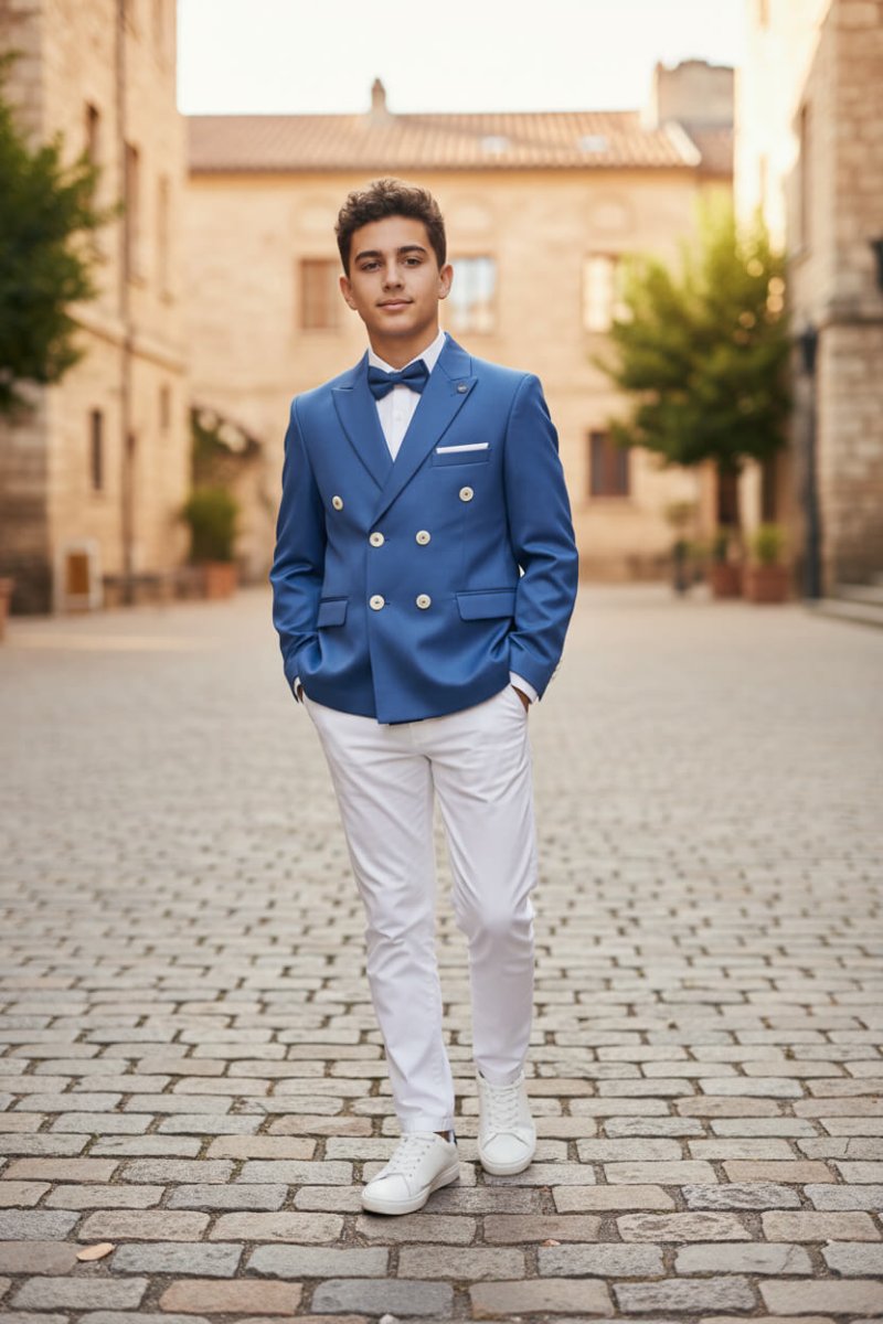 Completo elegante da cerimonia adatto per Battesimo Paggetti ed Eventi Composto da 4 Pezzi: Giacca โ Camicia โ Papillon โ Pantalone โ Giacca doppiopetto โ Pantalone โ Vestibilitร : Normale Questo completo รจ progettato con attenzione e cura, offrendo una combinazione perfetta di eleganza e stile