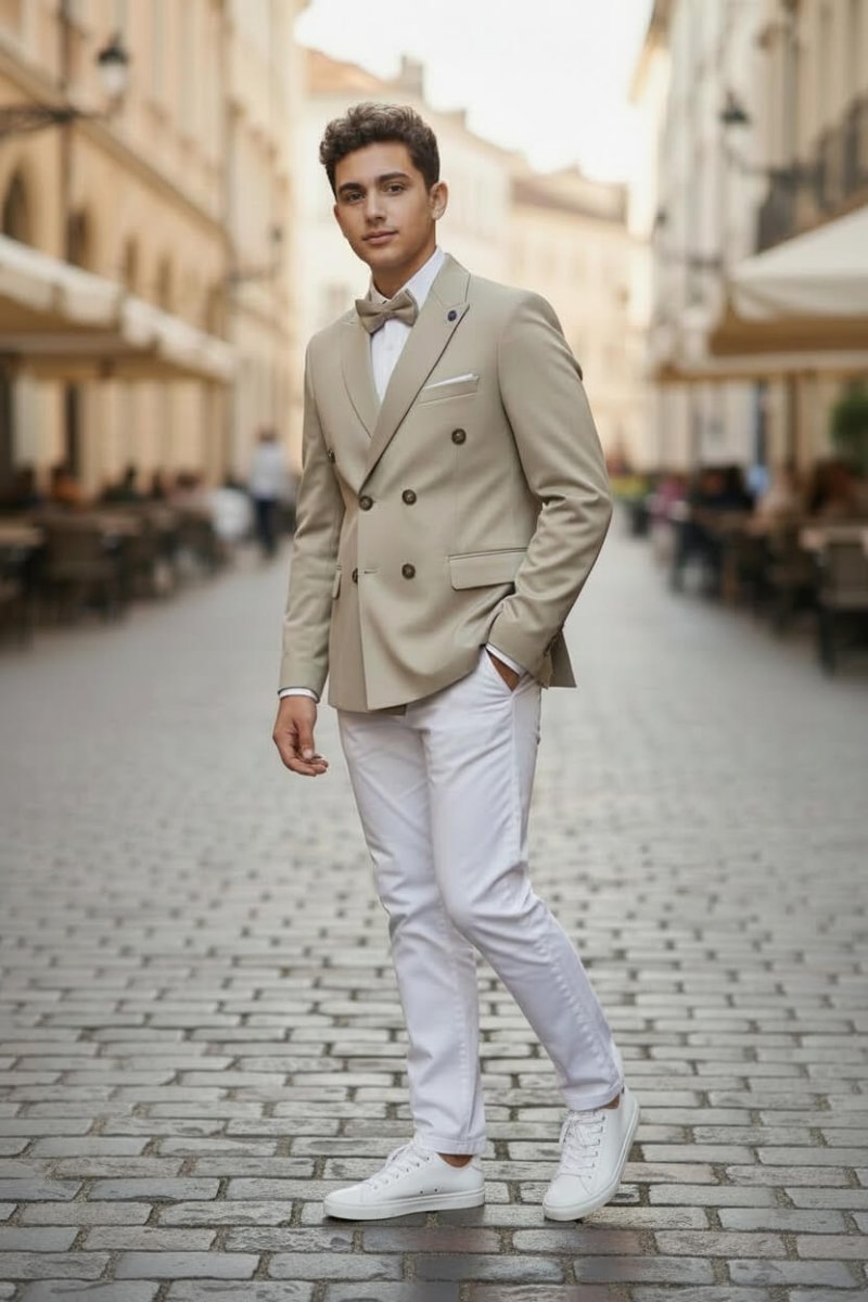 Completo elegante da cerimonia adatto per Comunione,Cresime ed Eventi Composto da 4 Pezzi: Giacca โ Camicia โ Papillon โ Pantalone โ Giacca doppiopetto โ Pantalone โ Vestibilitร : Normale Questo completo รจ progettato con attenzione e cura, offrendo una combinazione perfetta di eleganza e stile