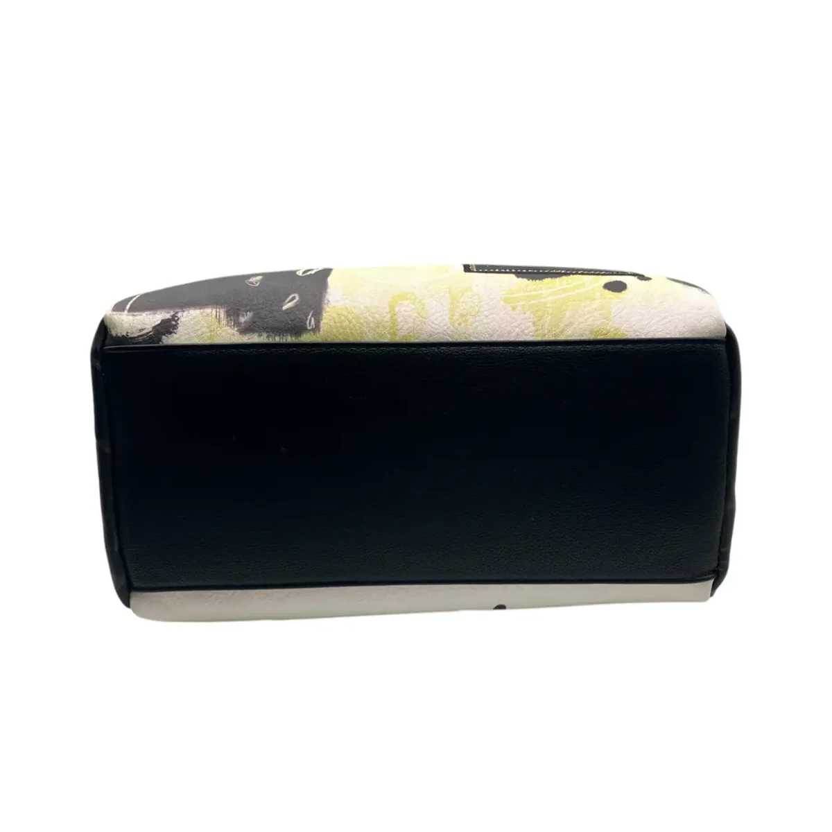 Tracolla rimovibile in pelle vegana e tessuto di poliestere leggermente imbottito e foderato multicolore. Doppia faccia. Due tasche esterne con cerniere. Due scomparti centrali con cerniere. Rifiniture in metallo Zamac. Misure: altezza 19 cm, larghezza 27 cm, profondità 13 cm.
