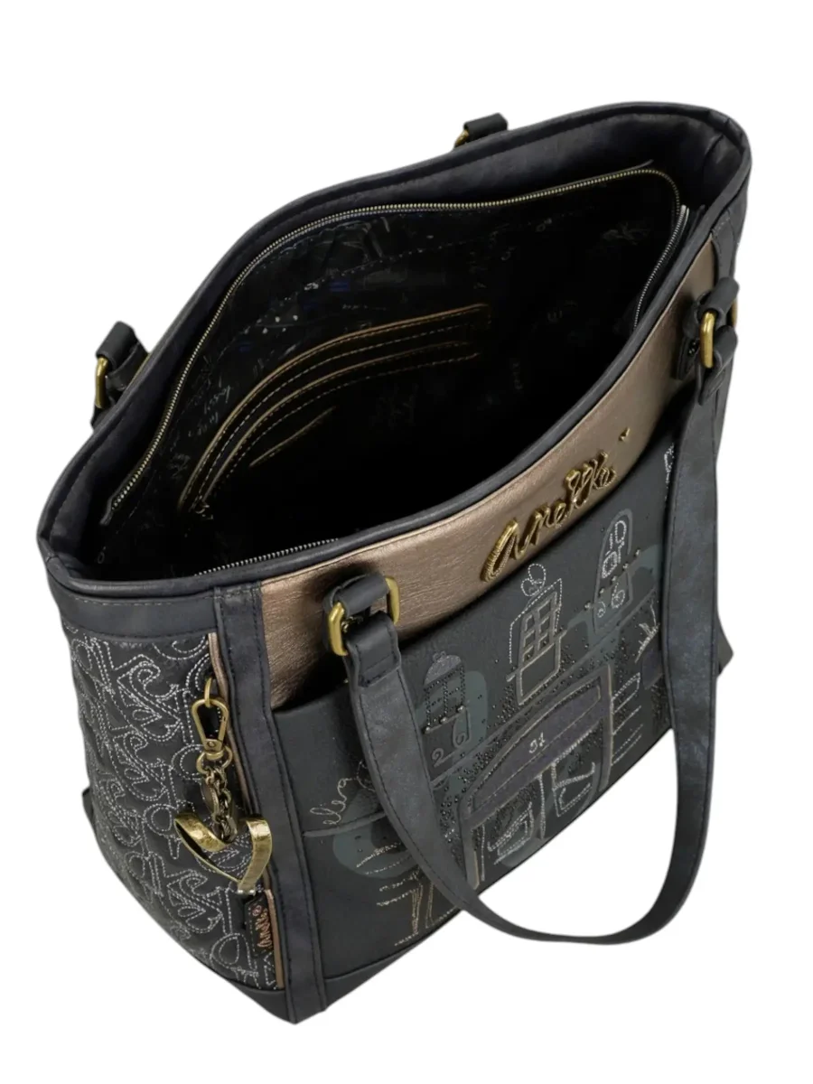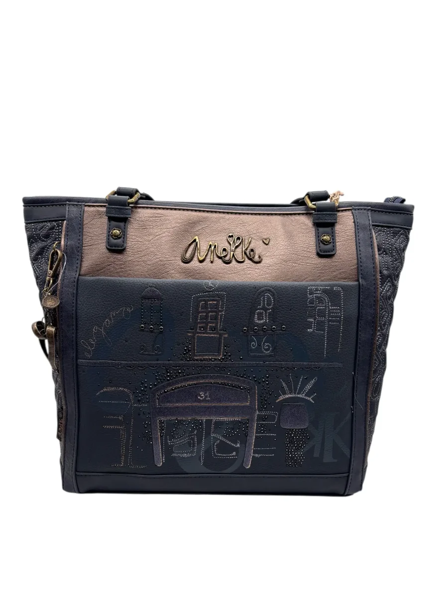 Borsa a spalla grande Boutique. Borsa tote che presenta una combinazione di colori scuri, caratterizzata da una divisione in pannelli con texture e decorazioni differenti. I lati sono realizzati in similpelle trapuntata con un motivo decorativo a ricamo, che aggiunge texture e un tocco di eleganza. È dotata di manici robusti per essere portata a spalla e di una tracolla regolabile, offrendo versatilità nel trasporto. Un charm decorativo pendente arricchisce il design. Dotata di dustbag. Misure (Lunghezza x Altezza x Larghezza): 40 cm/29 cm/16 cm