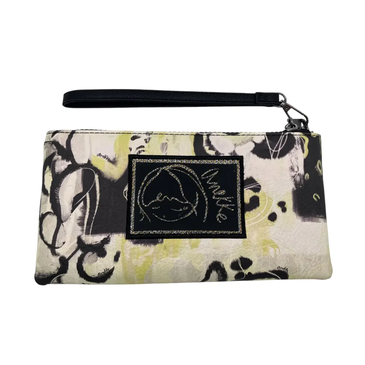 Pochette portata al polso in pelle vegana multicolore. Ref. Memories 40879-023. Due scomparti chiudibili con cerniera. Sacchetto protettivo incluso. Misure: altezza 11 cm, larghezza 21.5 cm, profondità 2.5 cm circa.