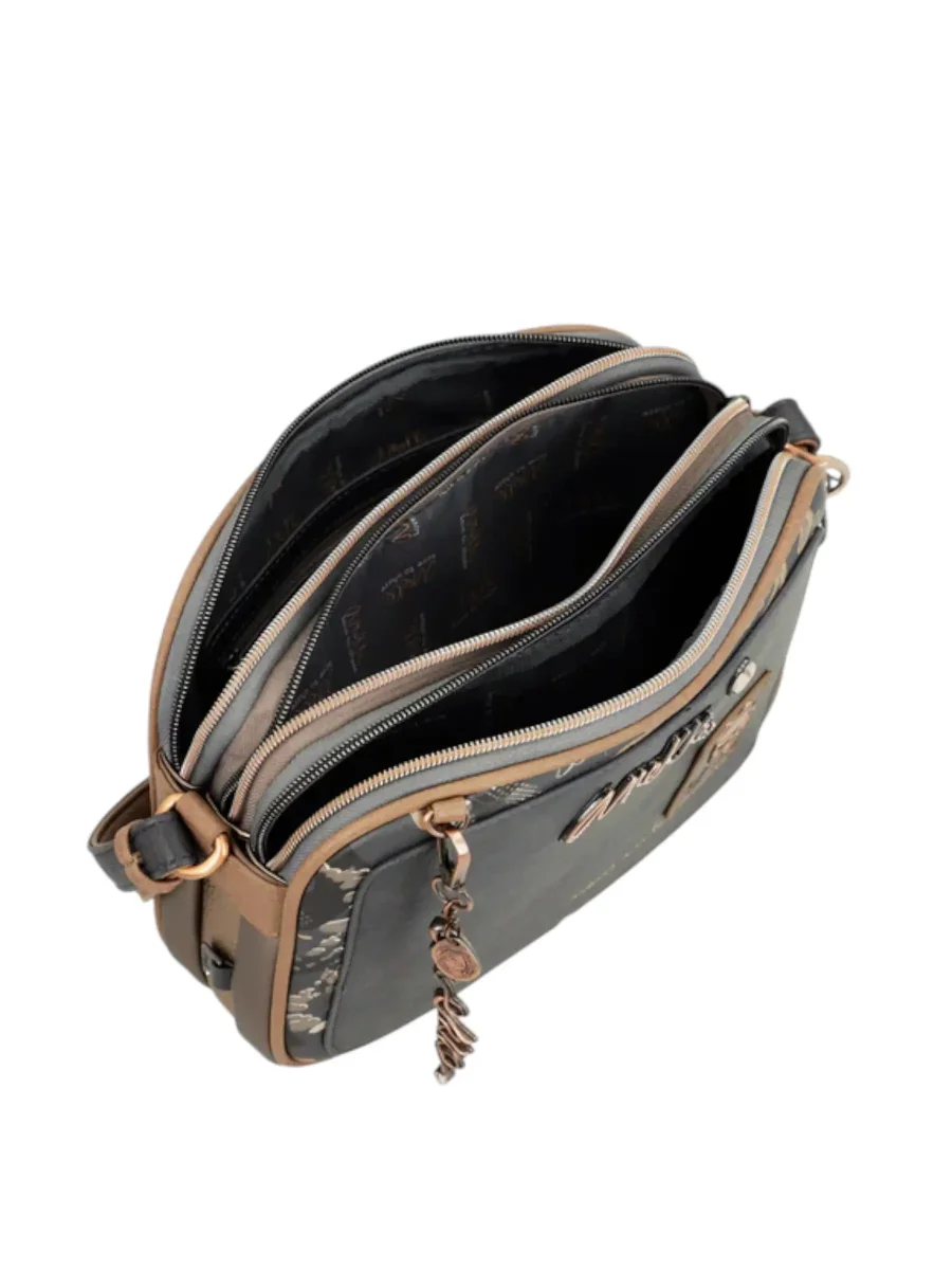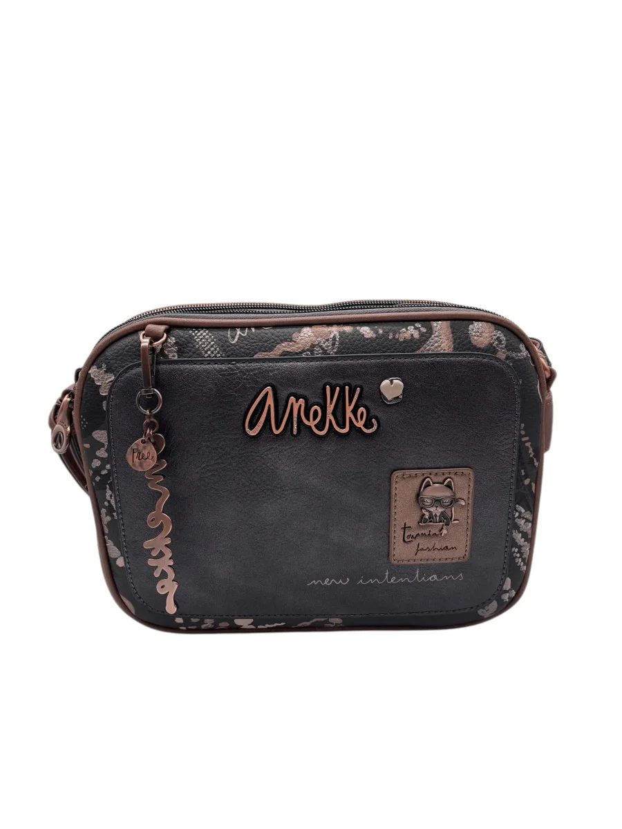 Anekke – Tracolla 3 scomparti Intentions. Mini-bag ideale per cellulare e essenziali. Strutturata con un’eccezionale organizzazione grazie al design multi-scomparto con cerniere multiple. Tracolla sottile e regolabile in similpelle scura. Dettagli in metallo color ottone e charm. Dotata di dustbag. Misure (Lunghezza x Altezza x Larghezza): 25 cm/19 cm/6 cm