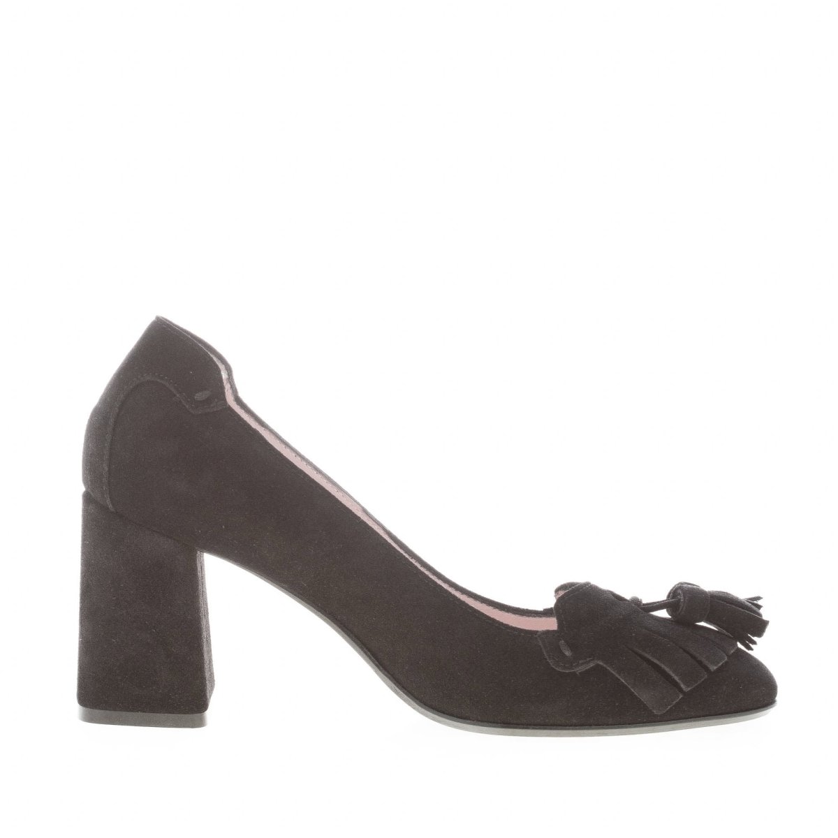 ANNA F. donna decolletè in camoscio NERO con frangia e nappine. Tacco 8 cm