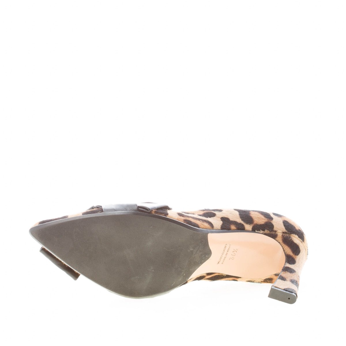 Decolletè a punta realizzato in cavallino maculato con macro fiocco decorativo incrociato sulla punta in nappa nera. Tacco di 9 cm. Suola in cuoio con inserto in gomma anti-scivolo