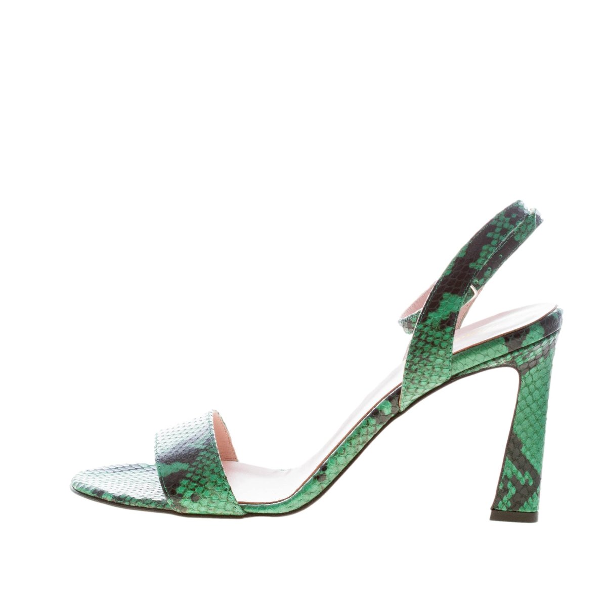 Sandalo realizzato in pelle stampa pitone verde con singola fascia sul piede e chiusura con cinturino incrociato alla caviglia e fibbietta regolabile. Tacco di 10 cm. Suola in cuoio