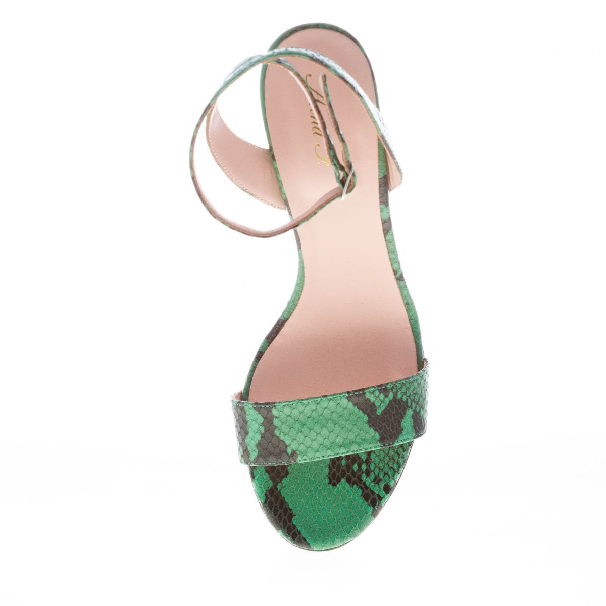 Green reptile print leather made in Italy sandal with single open toe and an ankle strap closure with a crossed buckled strap. Heel 10 cm. Leather sole