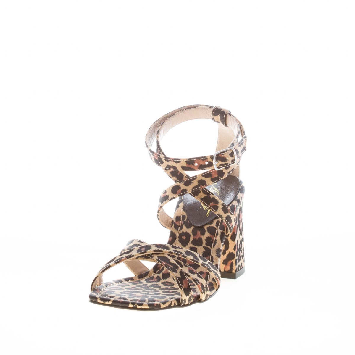 Sandalo realizzato in tessuto animalier con fasce incrociate sul piede. Chiusura con cinturino incrociato alla caviglia e fibbia regolabile. Tacco di 7,5 cm. Suola in cuoio