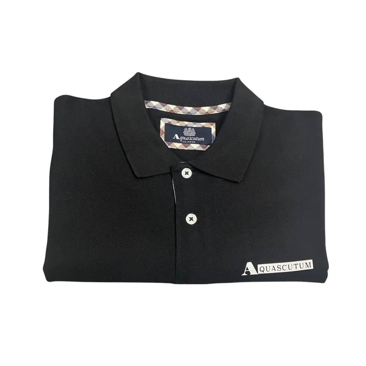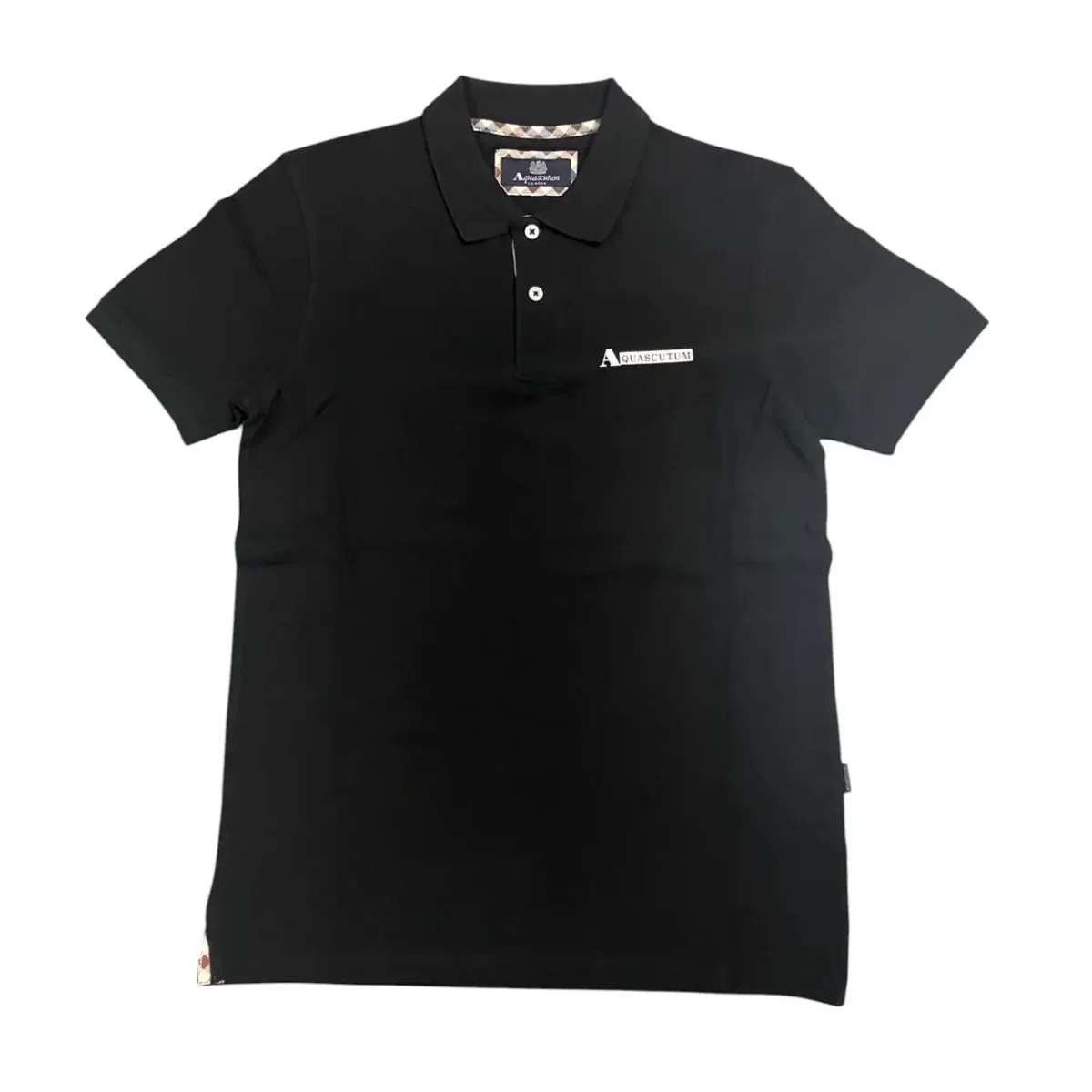 Questa รจ una polo da uomo del marchio Aquascutum. ร realizzata in tessuto piquรฉ di colore nero e presenta un design classico con colletto a costine e chiusura a due bottoni. Sul petto sinistro รจ applicato un logo con scritta “Aquascutum”, mentre l’interno del colletto mostra il caratteristico motivo check del brand. Piccoli spacchi laterali con motivo check Aquascutum. Le maniche sono corte e rifinite con bordo a costine. Lo stile รจ elegante e casual, perfetto per un look raffinato ma rilassata
