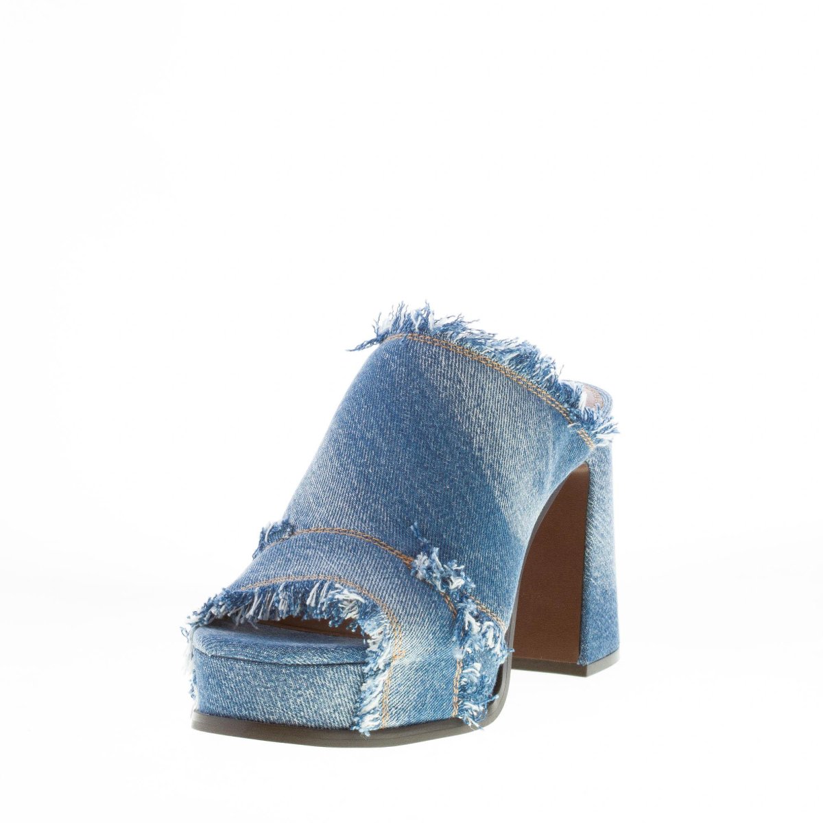 Blue denim fabric Maui open toe mule with frayed edges and exposed stitchings. Covered platform 3 cm and column heel 9,5 cm. Leather sole with antislippering rubber insert