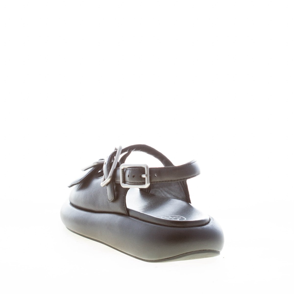 Sandalo Virgy in morbida nappa imbottita nera con fasce e doppia fibbia in metallo argento. Chiusura con cinturino elasticizzato al tallone e fibbia regolabile. Fussbett in pelle imbottita. Flatform in pelle con altezza al tacco di 4 cm. Suola in gomma