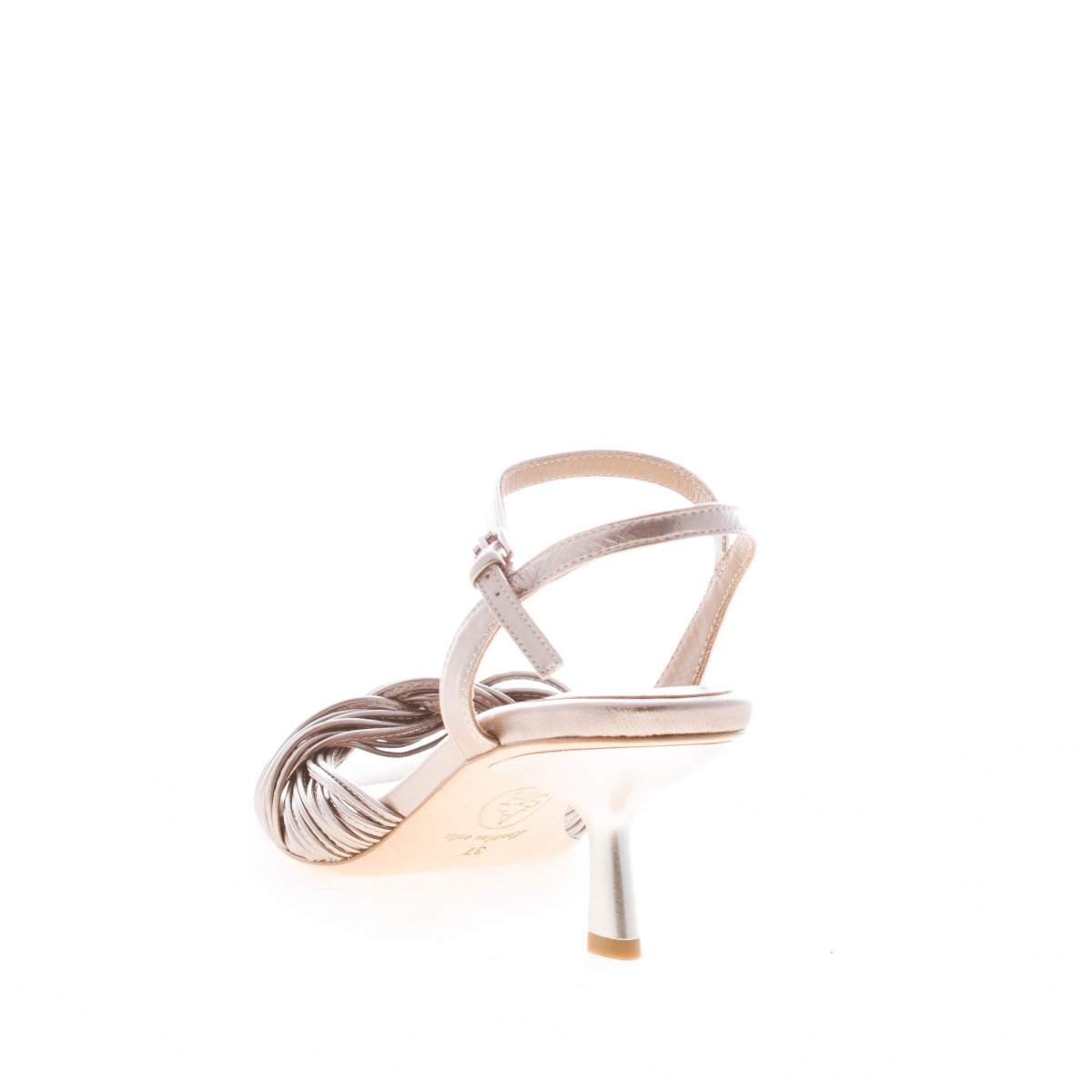 Champagne tone leather Janis heel sandal with two knotted bands made with multiple thin straps. Ankle strap closure with adjustable golden metal buckle.ย Heel 5,5 cm. Leather sole