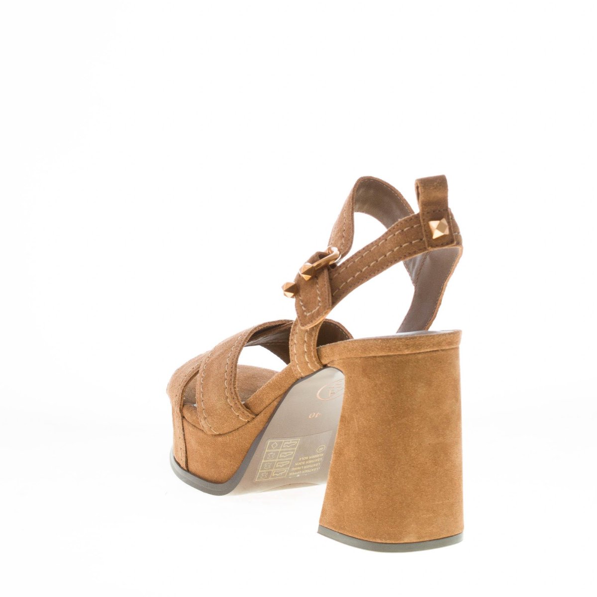 Brown suede Melany sandal with two crossed open toe bands and an ankle strap closure with a golden color adjustable buckle. Decorative tonal stitchings throughout the straps. Covered platform 4 cm and column heel 10 cm. Rubber sole