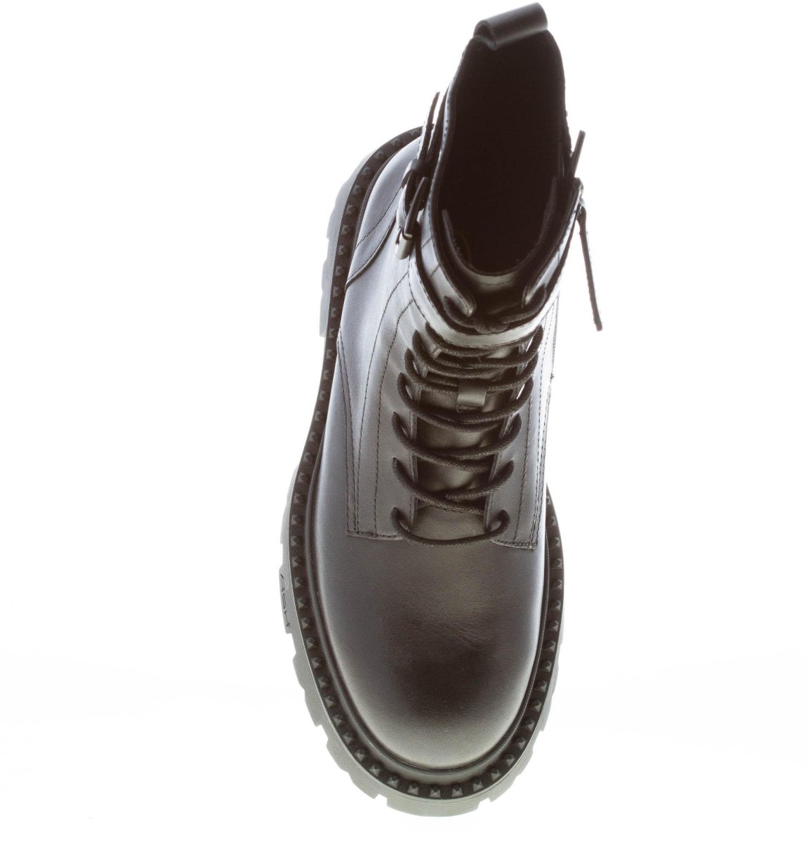 Black soft leather Gena biker boot with a plain round toe, front lacing and side zip fastening. Buckled strap. Heel 3 cm. Ridged rubber outsole