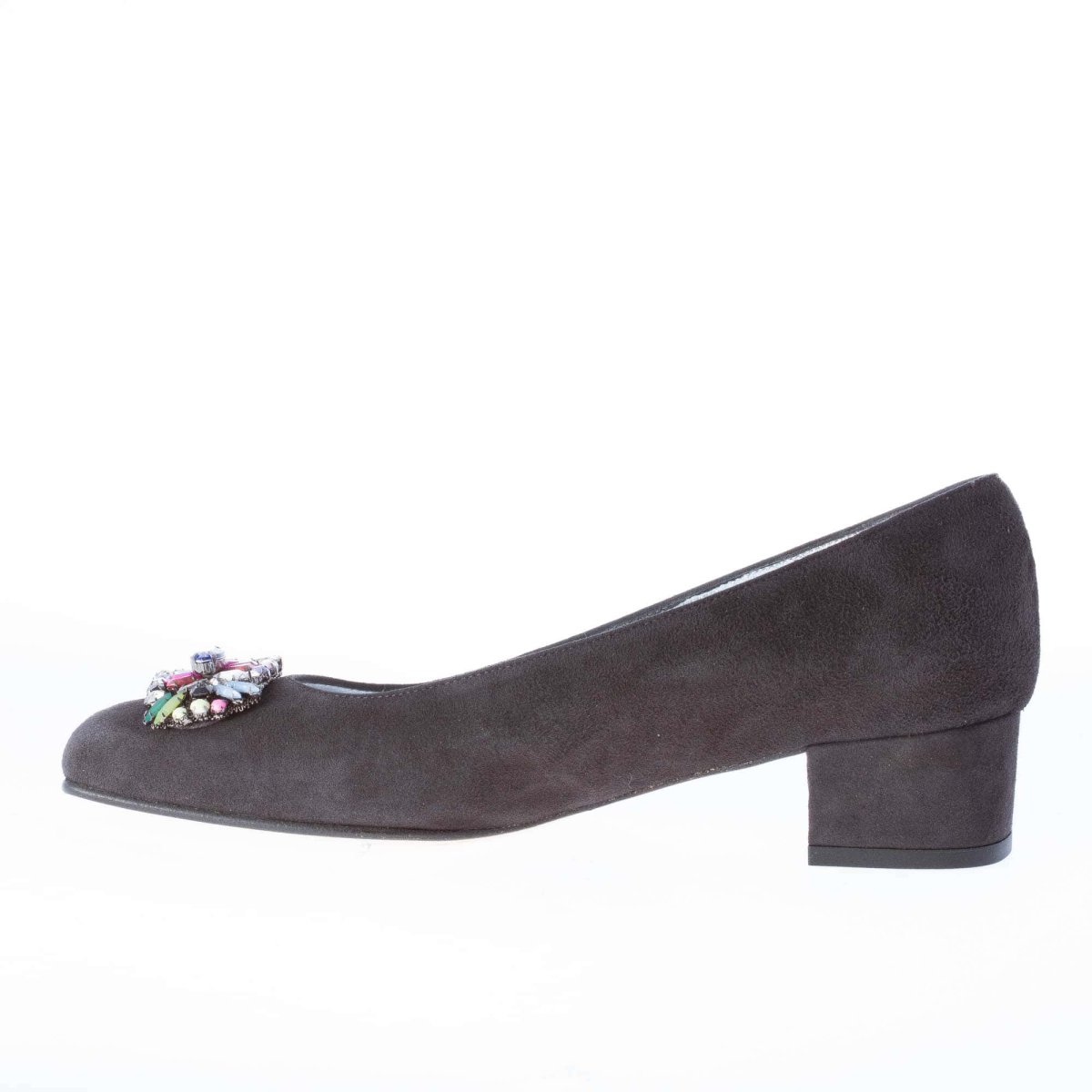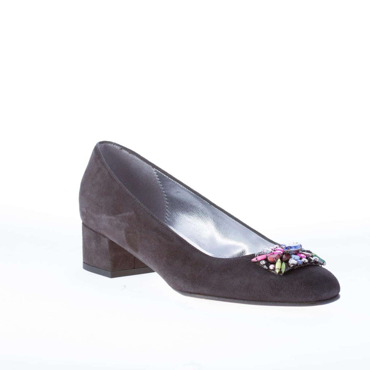 Décolleté in camoscio grigio scuro con gioiello in swarovski multicolore sulla punta. Suola in gomma. Tacco 3,5 cm