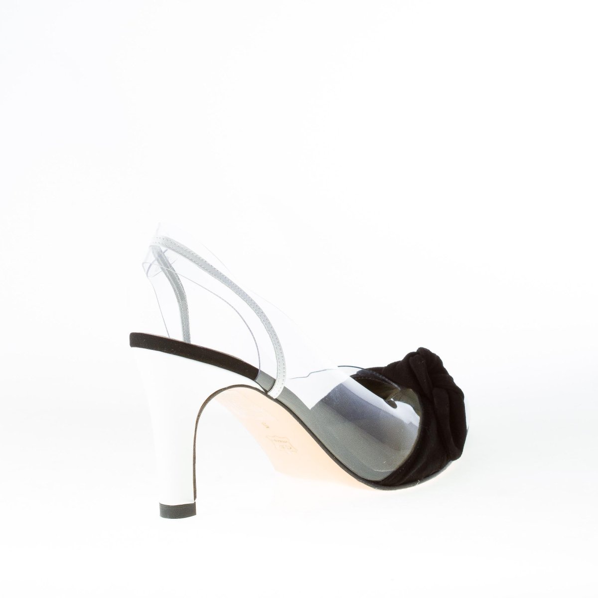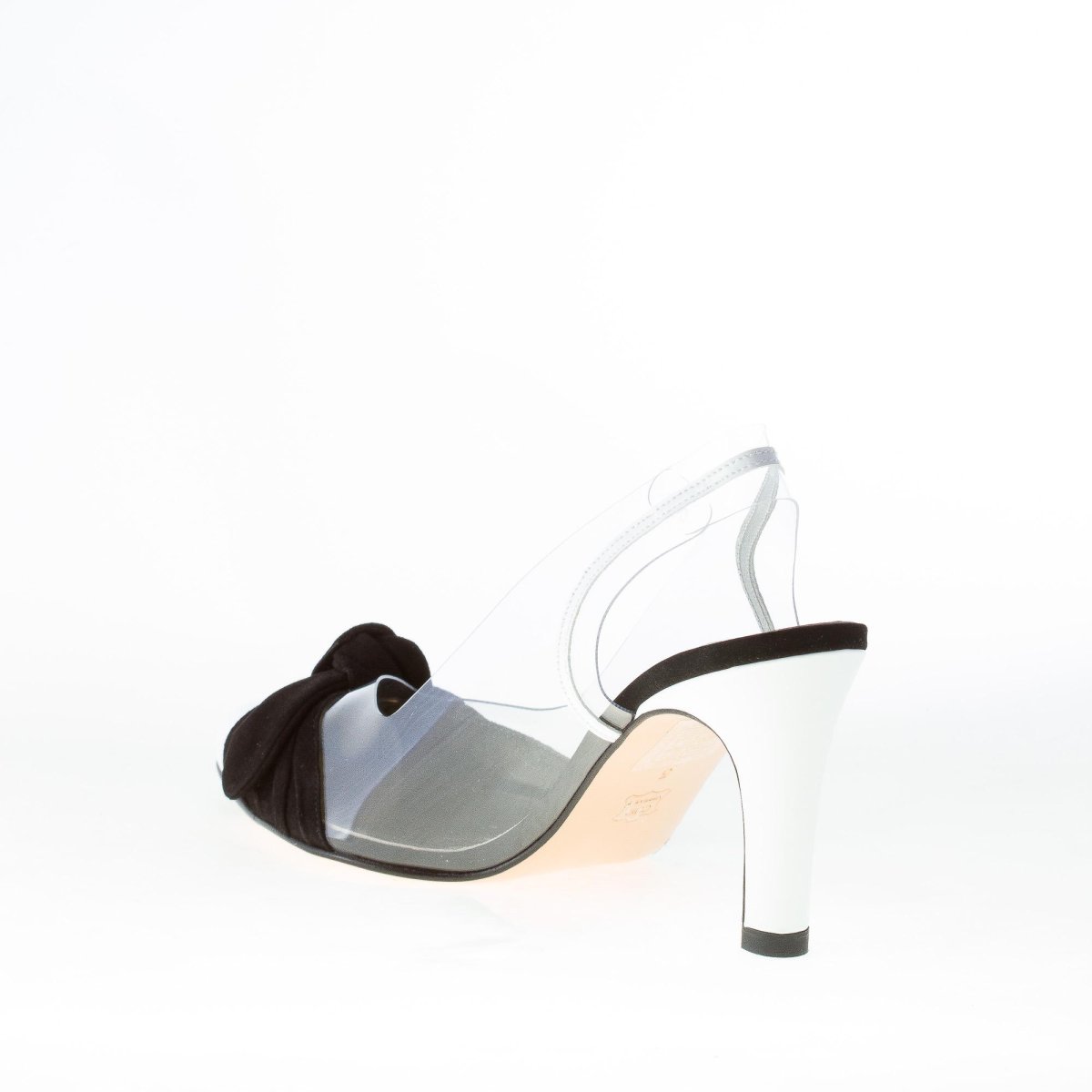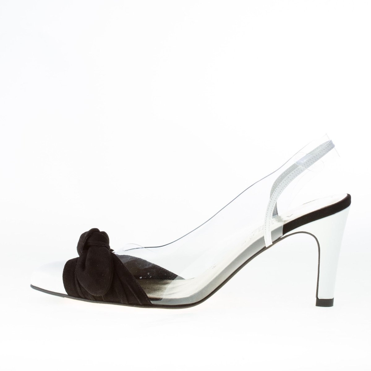 Transparent “crystal” LIGUE slingback shoes with white patent leather and black suede bow detail. Leather sole. Heel 8,5 cm