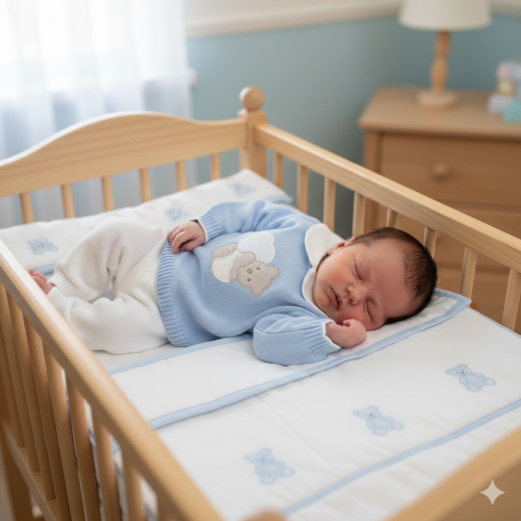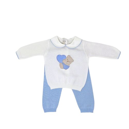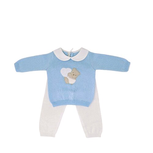 Questo è un raffinato completo per neonato composto da due pezzi coordinati in maglia, caratterizzato da un design classico e unestetica tenera. Dettagli del Design Maglioncino: Il capo superiore è un maglioncino a maniche lunghe. Presenta un elegante colletto Peter Pan bianco a contrasto, che dona un tocco cerimonioso e pulito. Elemento Centrale: Al centro del petto spicca un’adorabile applicazione di un orsetto color tortora. L’orsetto tiene tra le zampe un grande cuore bianco decorato con una sottile trama a quadretti azzurri, creando un punto focale dolce e armonioso. Pantaloni: Il pezzo inferiore è costituito da ghettinein maglia, con polsini…