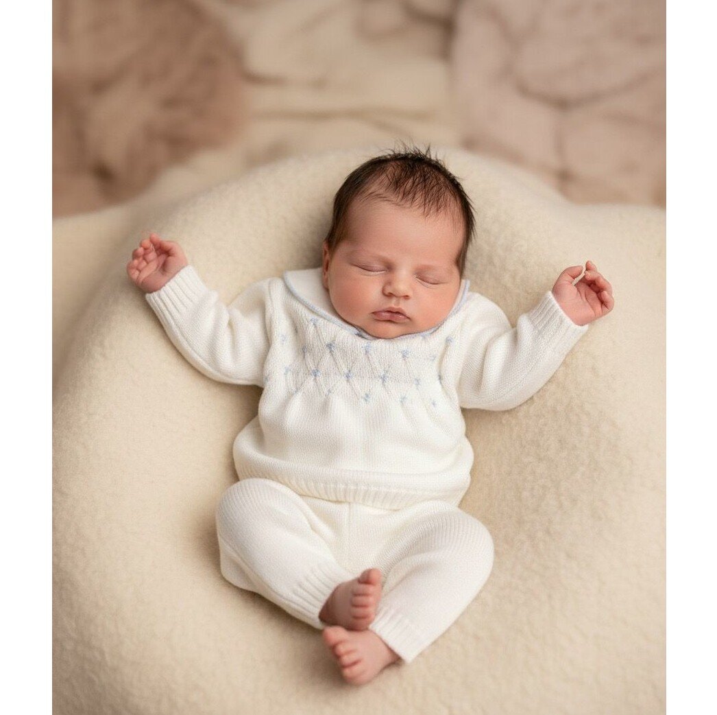 Completino nascita con ghettina in pura lana vergine 100% Ricamato a mano Completino “Primi Sogni” in Maglia con Dettagli Azzurro Cielo Eleganza delicata e morbidezza assoluta si fondono in questo set due pezzi, ideale per accogliere il tuo piccolo nei suoi momenti più importanti. Realizzato in una caldissima tonalità bianco panna, questo outfit è impreziosito da discreti dettagli color azzurro polvere che conferiscono un’aria sognante e senza tempo. Dettagli che fanno la differenza: Maglioncino con Lavorazione a Punto Smock: Il corpetto presenta una splendida lavorazione a rombi intrecciati, arricchita da piccoli ricami in azzurro cielo che donano tridimensionalità e pregio…