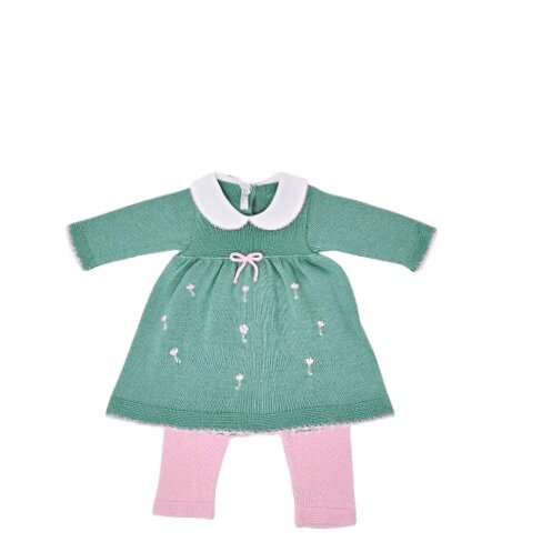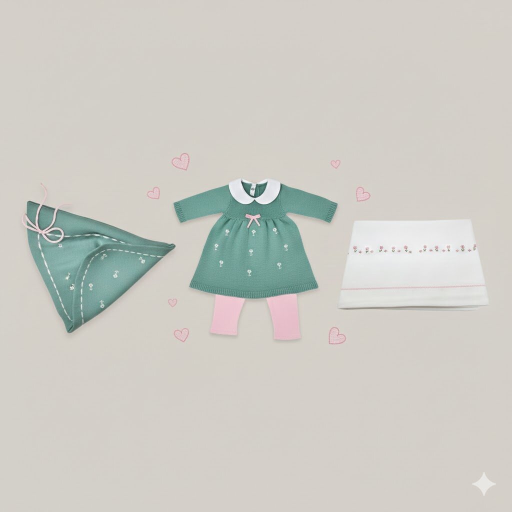 Coordinato in cotone 100% Aggiungi un tocco di colore raffinato al guardaroba della tua piccola con questo splendido set in maglia di cotone verde salvia. Un abbinamento cromatico moderno e delicato, perfetto per chi cerca un’eleganza originale ma classica. Cosa include il set: Coprifasce a Manica Lunga: Realizzato in maglia verde salvia, presenta un colletto bianco arrotondato con profilo rosa, un grazioso fiocchetto centrale e piccoli fiori ricamati. I polsini e il fondo sono rifiniti con un delicato bordo a smerlo rosa. Leggings in Maglia: Comodi, coordinati in una tonalità rosa confetto, ideali per garantire libertà di movimento e calore.…