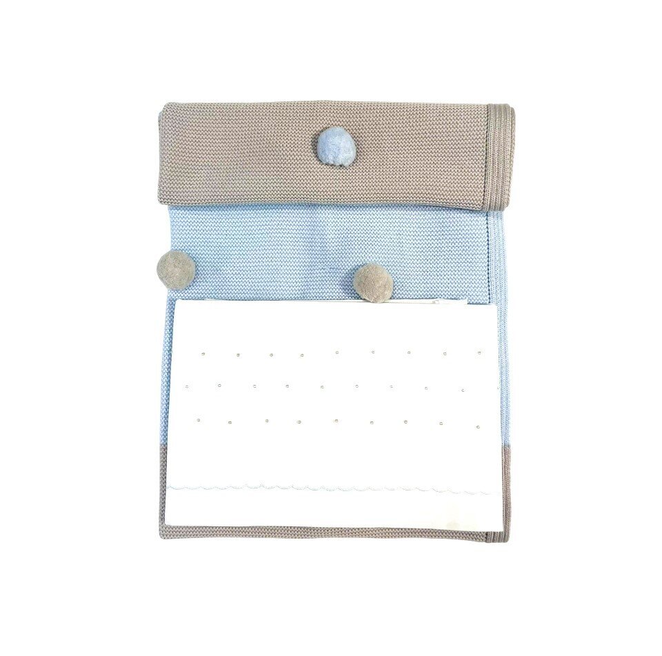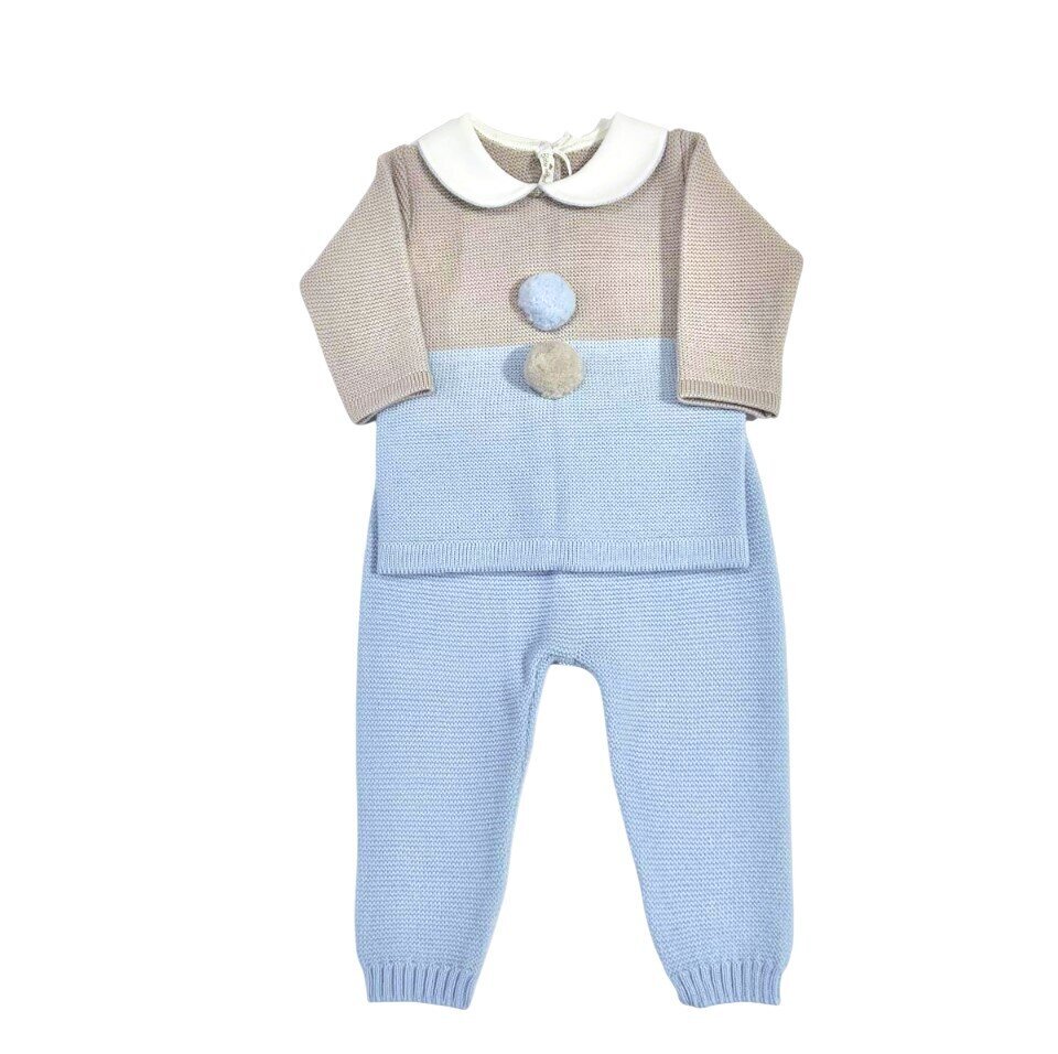 Coordinato in pura lana 100% Questo elegante set per neonato è realizzato in una morbida maglia rasata con un design a blocchi di colore: Maglia: Presenta una parte superiore color tortora e una inferiore celeste, divise centralmente da due soffici pom-pom decorativi in tonalità contrastanti. È rifinita con un colletto “Peter Pan” bianco in tessuto liscio che aggiunge un tocco classico. Pantalone: Coordinato in maglia celeste, con polsini elasticizzati alle caviglie per garantire il massimo comfort. 2. Coperta Coordinata in Maglia Una coperta calda e soffice che riprende perfettamente i colori e i dettagli del completino: Realizzata con la stessa…