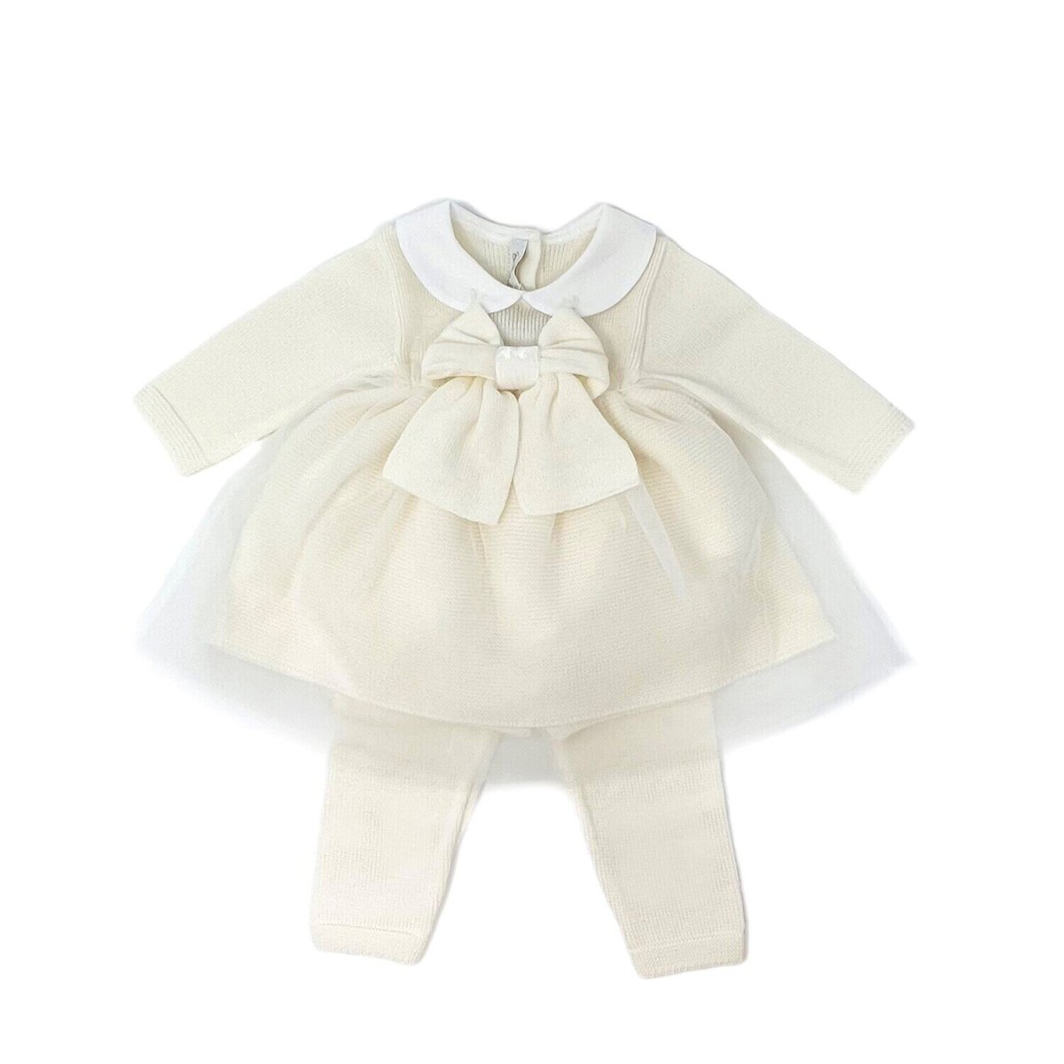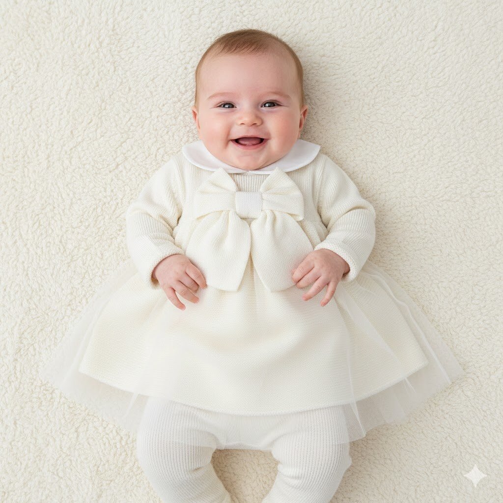 Coprifasce con ghettina in pura lana vergine Rendi indimenticabili i primi momenti speciali con questo raffinato completino in due pezzi. Caratterizzato da un design classico e senza tempo, questo set combina la morbidezza della maglia con dettagli sofisticati, ideale per cerimonie, battesimi o per un regalo di nascita indimenticabile. Dettagli che fanno la differenza: Design a Abito: Il pezzo superiore simula un grazioso vestitino a maniche lunghe con un delicato colletto Peter Pan bianco a contrasto, perfetto per un look bon-ton. Dettagli Preziosi: Il punto luce dellintero outfit è il maxi fiocco centrale, abbinato a una gonna in tulle…