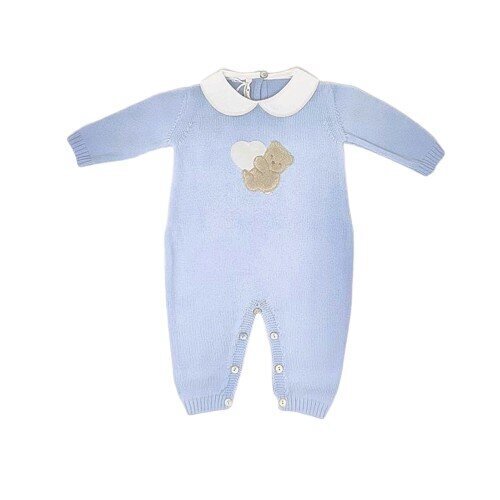 Tutina in pura lana vergine 100% con applicazione centrale di un tenero orsetto e di un cuore, collettino in rigatino di cotone.
