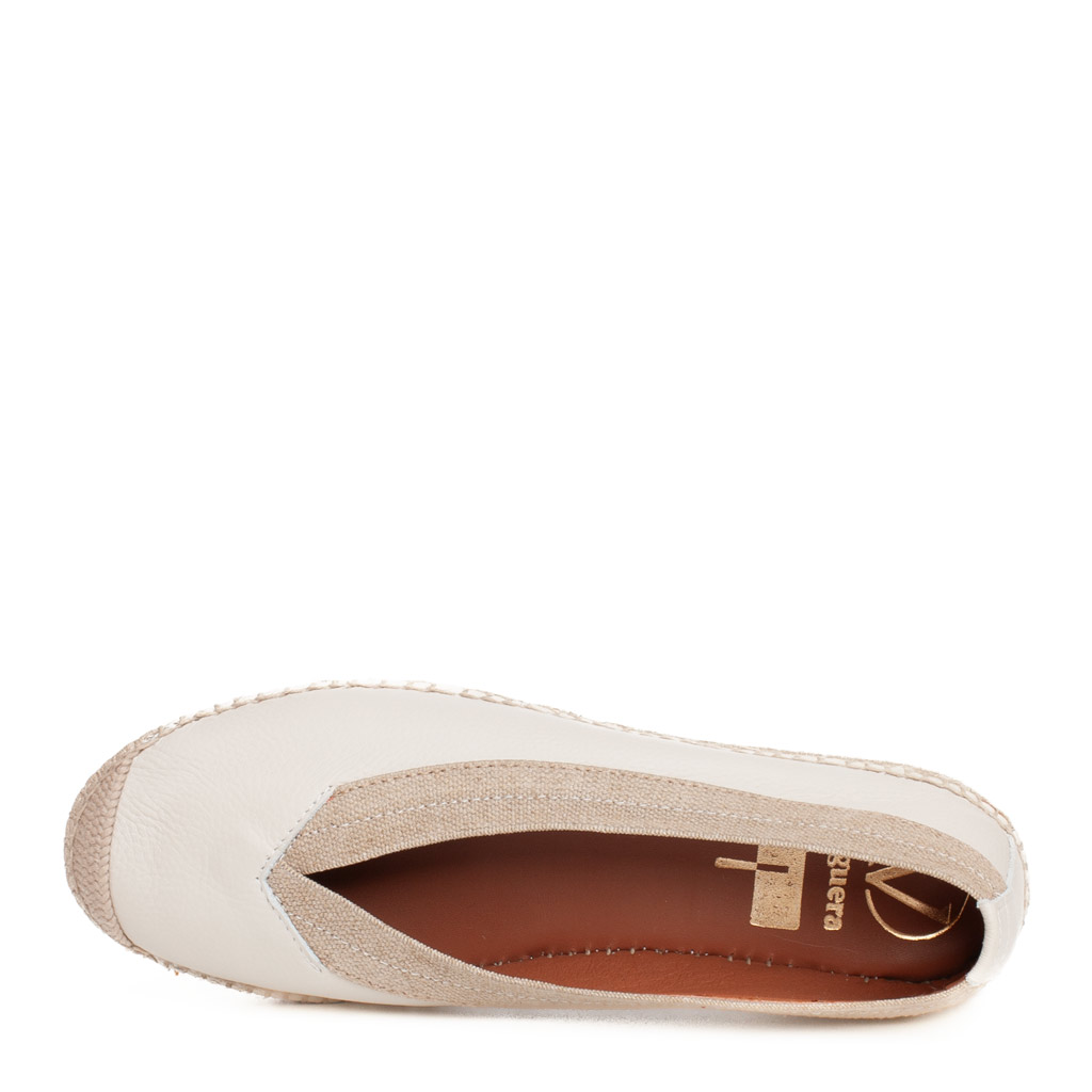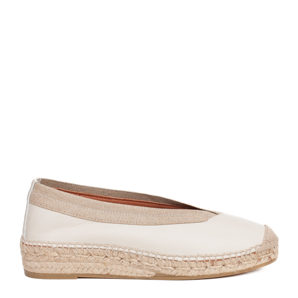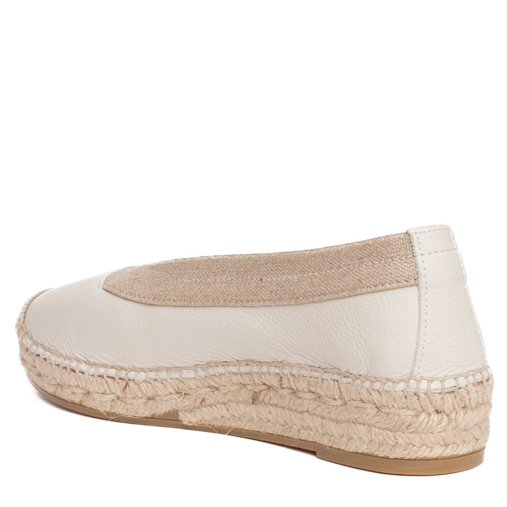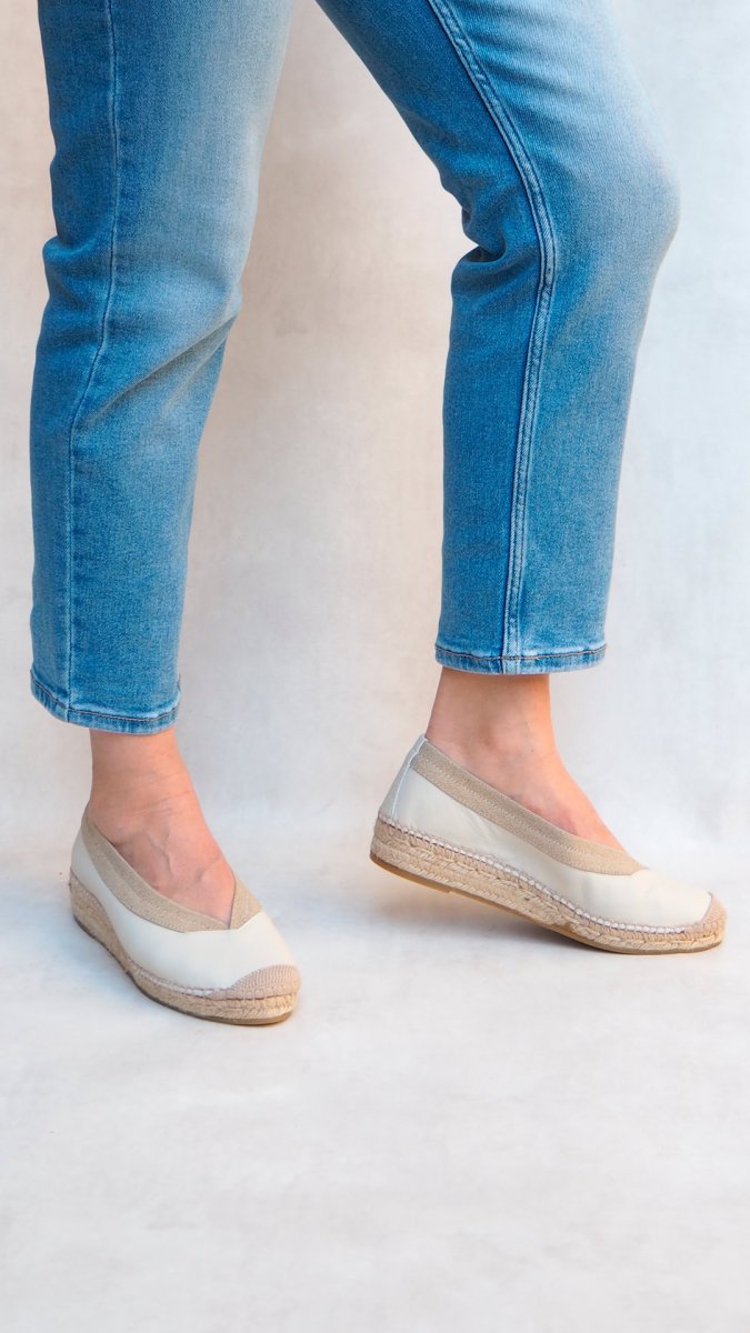 Scarpa con zeppa in corda in nappa avorio. L’elastico garantisceย facilitร nella calzata . Fodera in pelle. Suola in gomma. Altezza tacco 3 cm. Made in Spain.