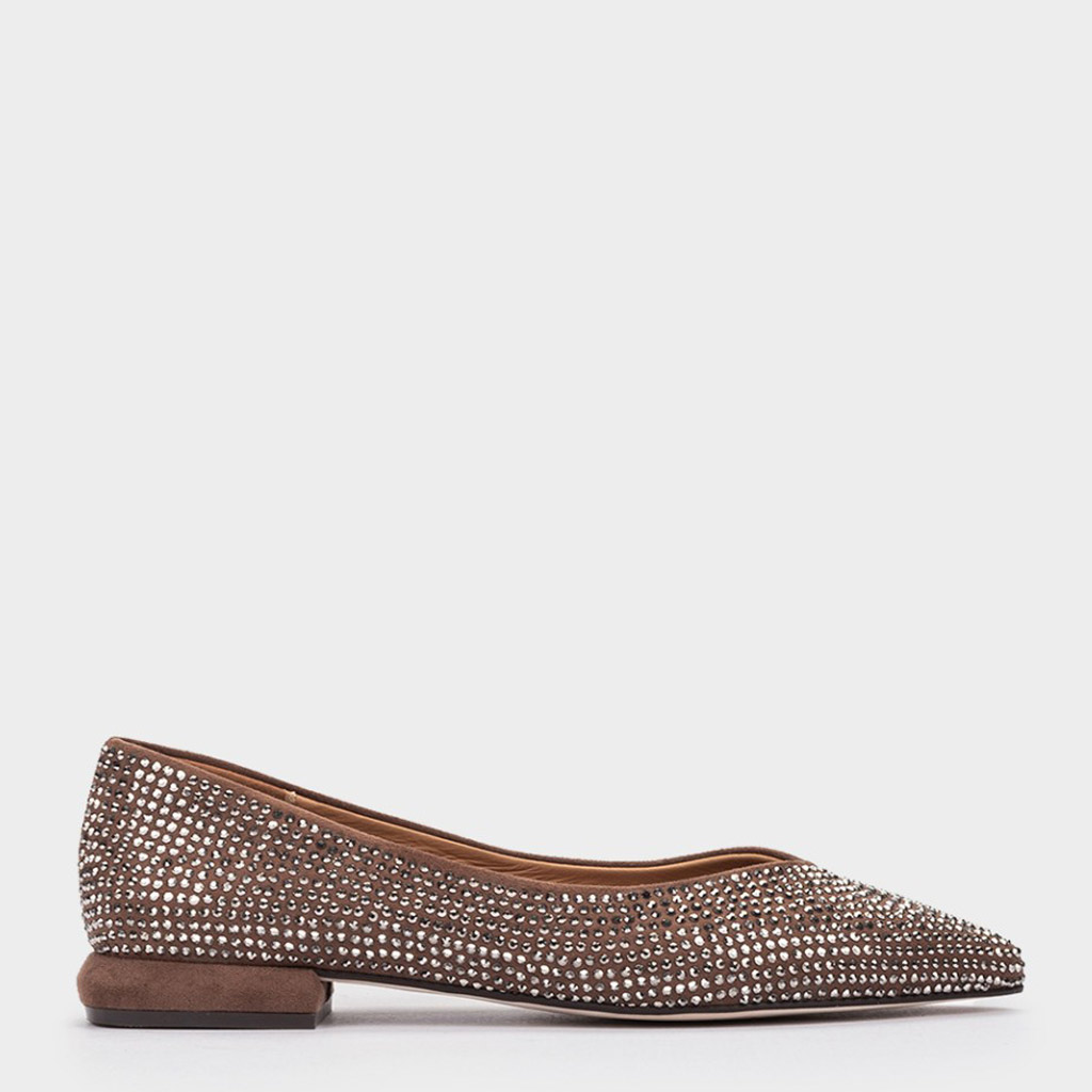 Scarpa bassa elegante in tessuto e camoscio con dettagli luminosi. La scollatura a V abbraccia la pianta del piede garantendo il comfort della calzata. Il tacco รจ alto 2 cm. La suola รจ in gomma. La fodera e la soletta sono in pelle. Realizzato artigianalmente in Spagna.