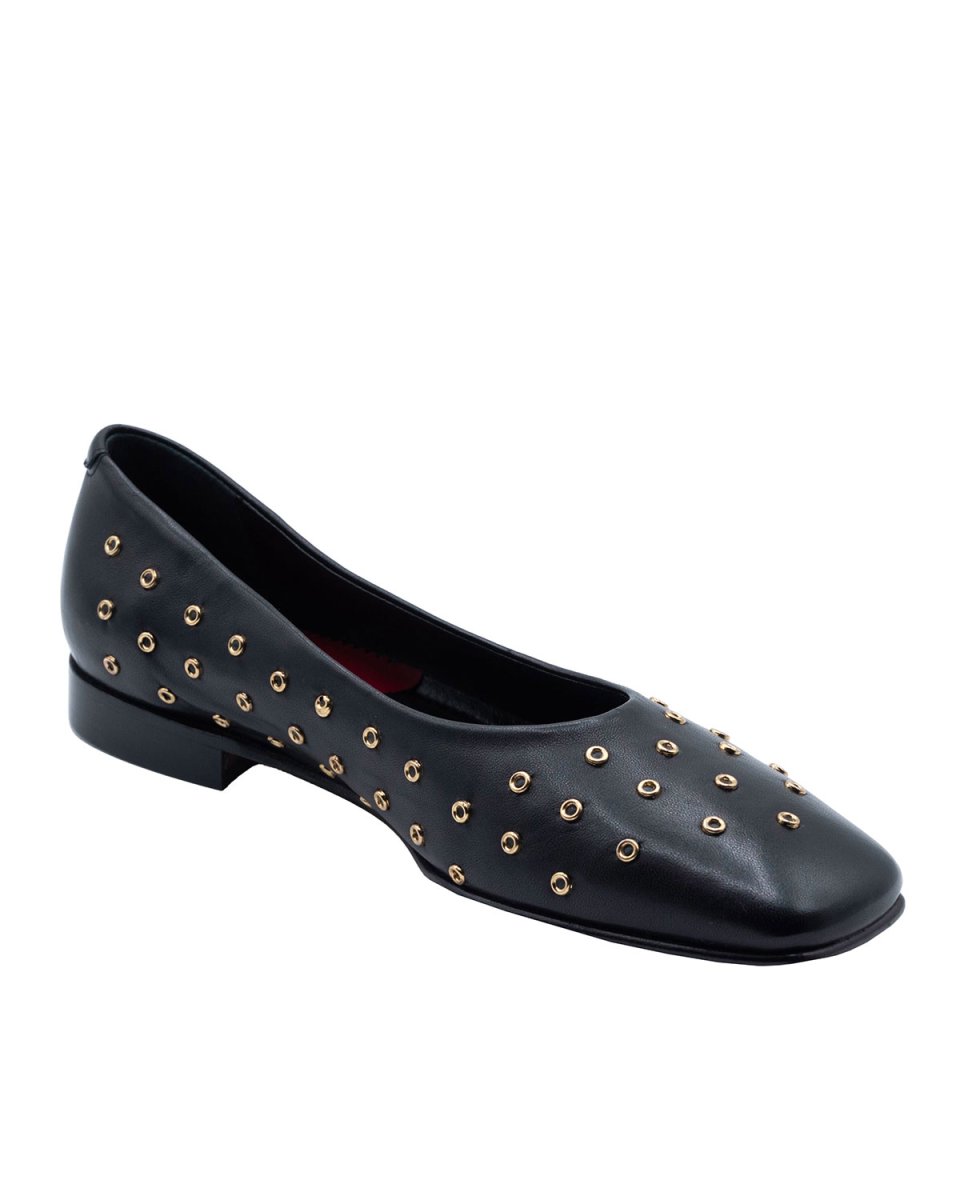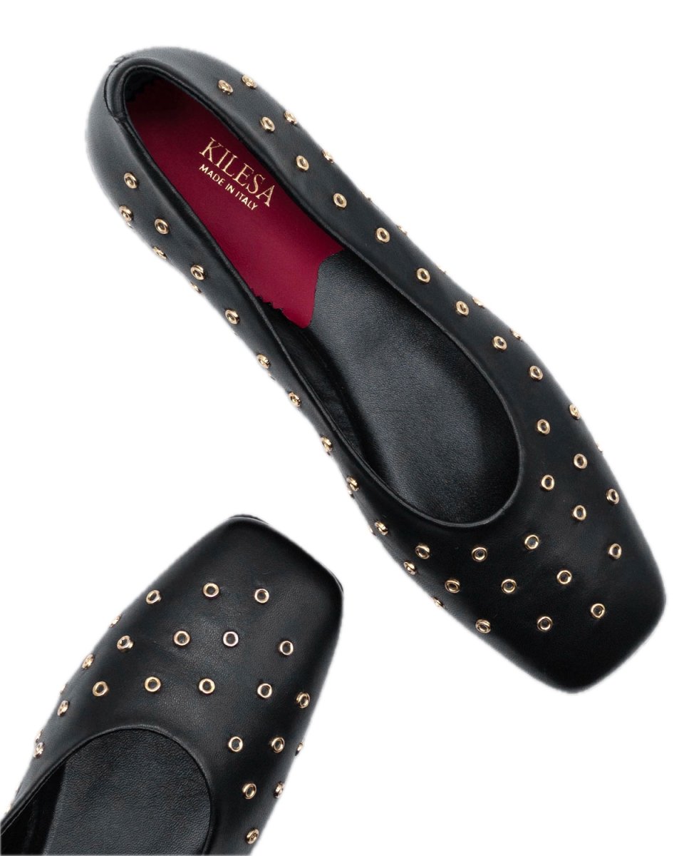 Scopri lโ€™eleganza senza tempo delle ballerine nere Kilesa, un connubio perfetto tra artigianalitร  italiana e stile sofisticato. Realizzate in nappa di vitello primo fiore, queste ballerine sono impreziosite da delicate borchiette tonde color oro, che donano un tocco di carattere e unicitร . La punta quadrata conferisce unโ€™allure moderna e raffinata, mentre il tacco di 2 cm assicura comfort e femminilitร  per tutto il giorno.