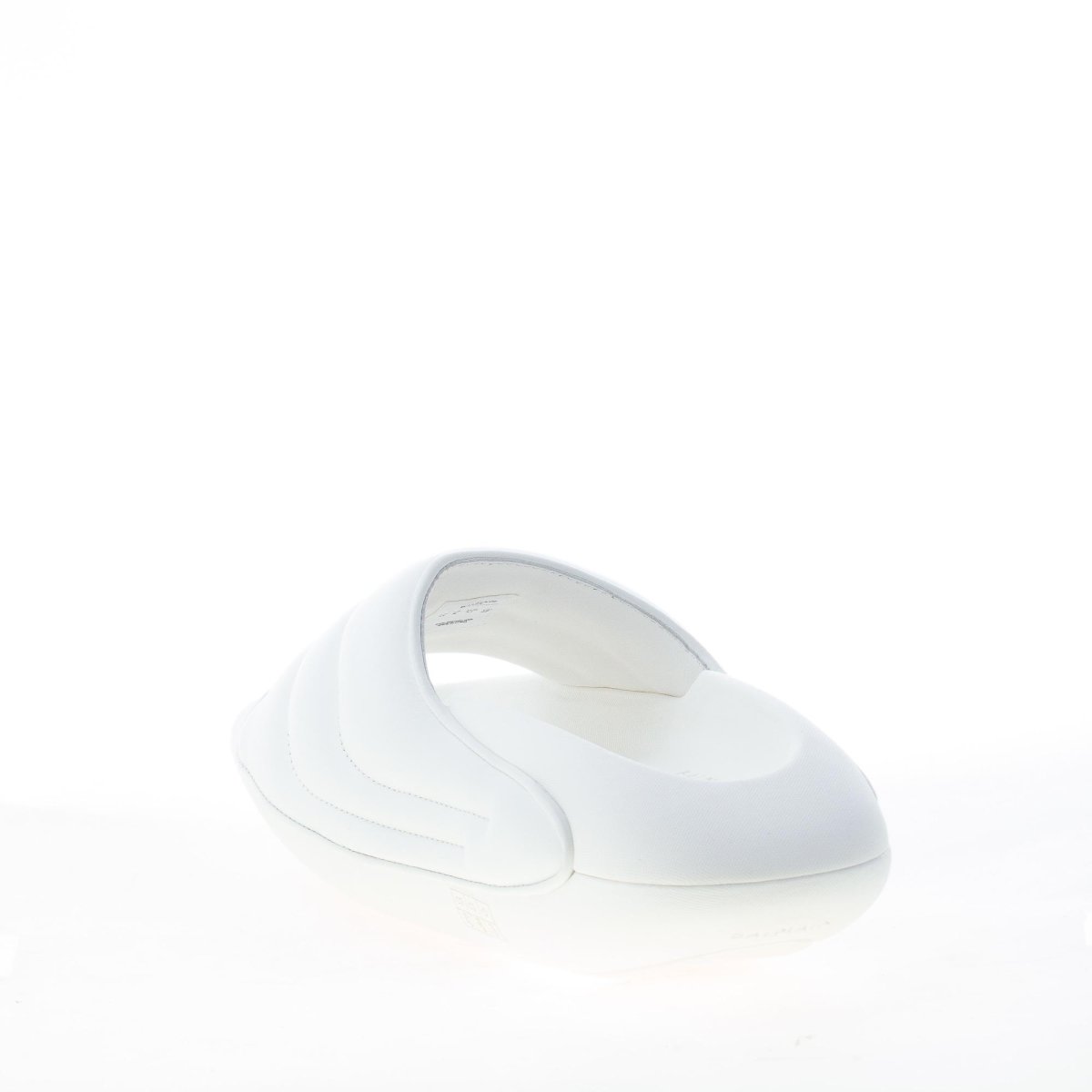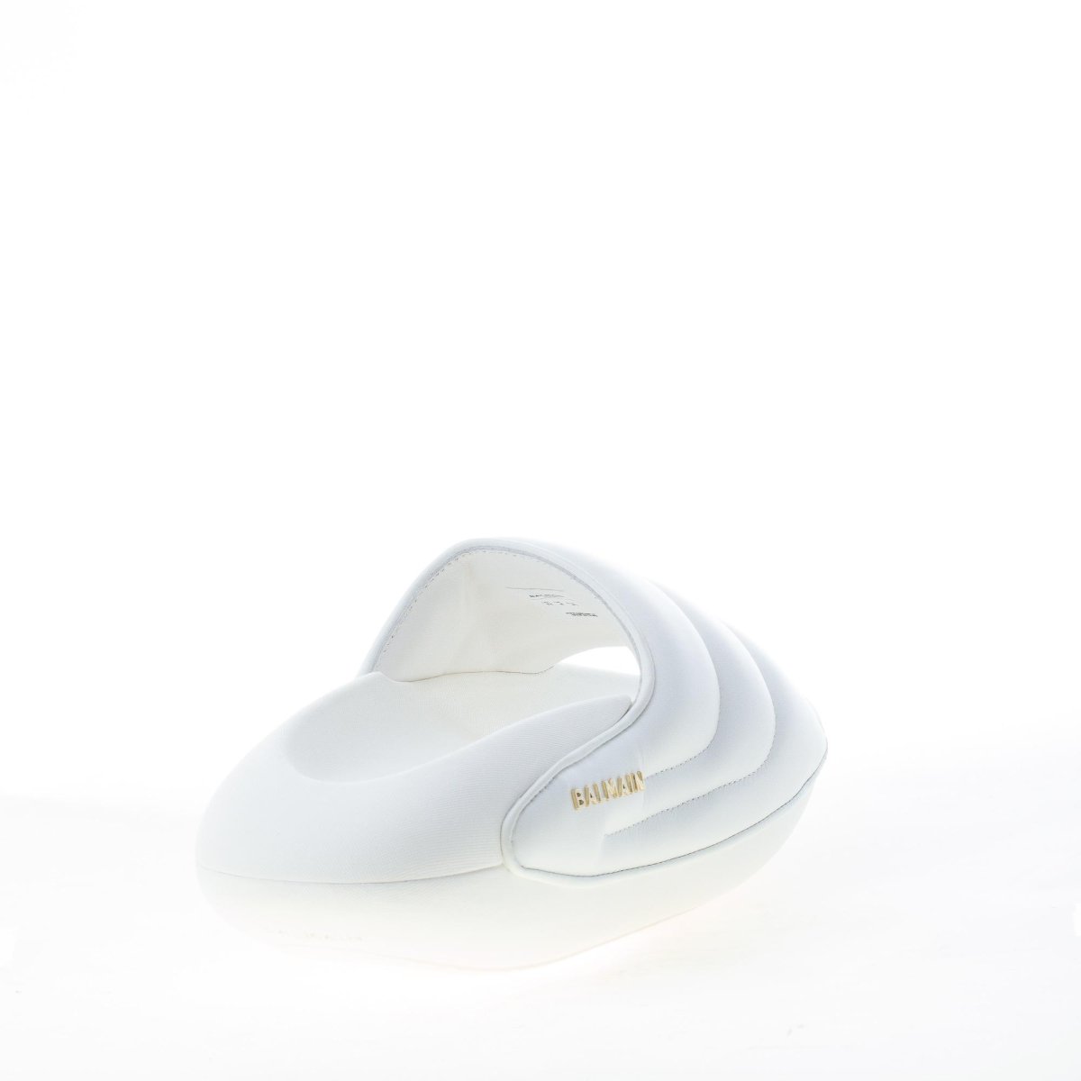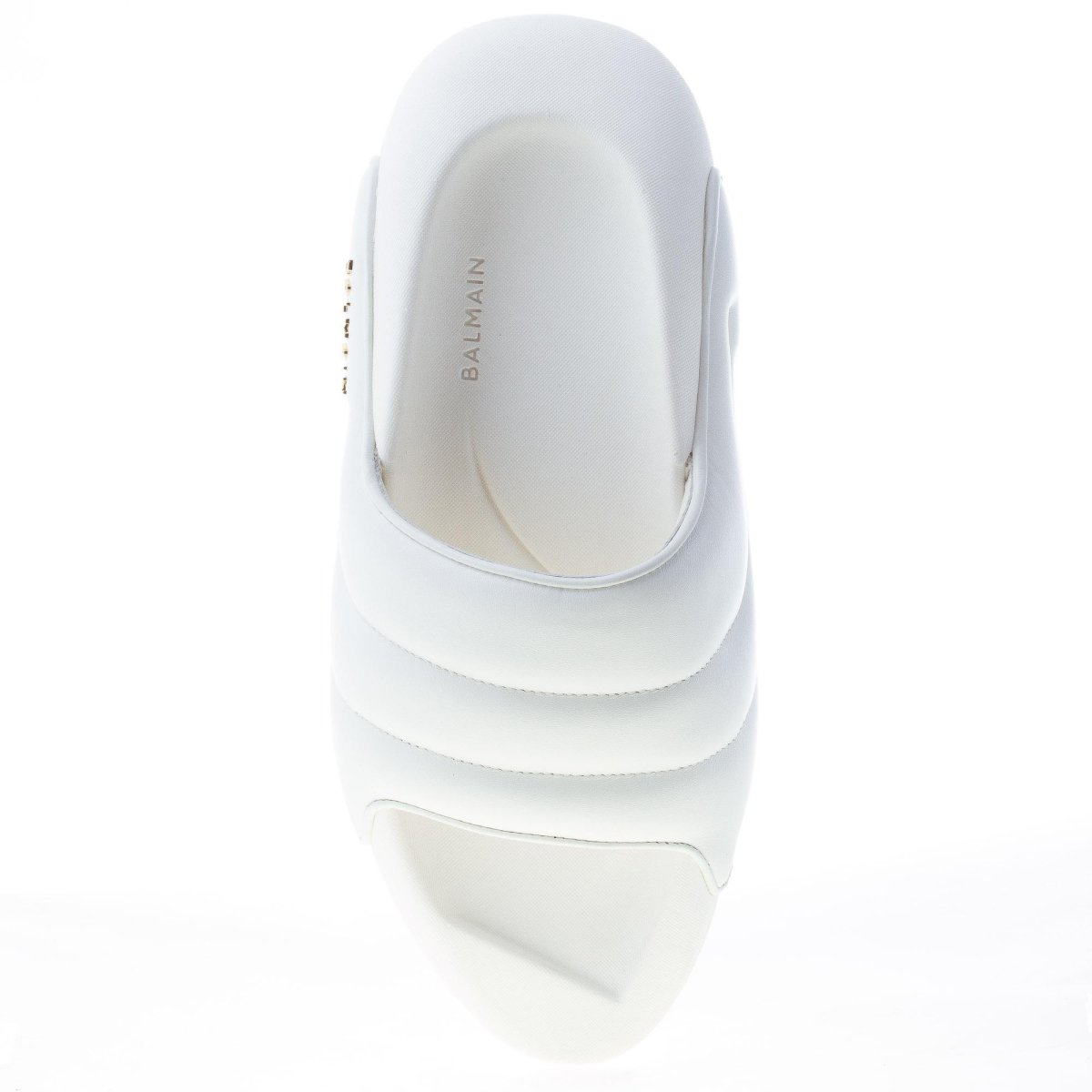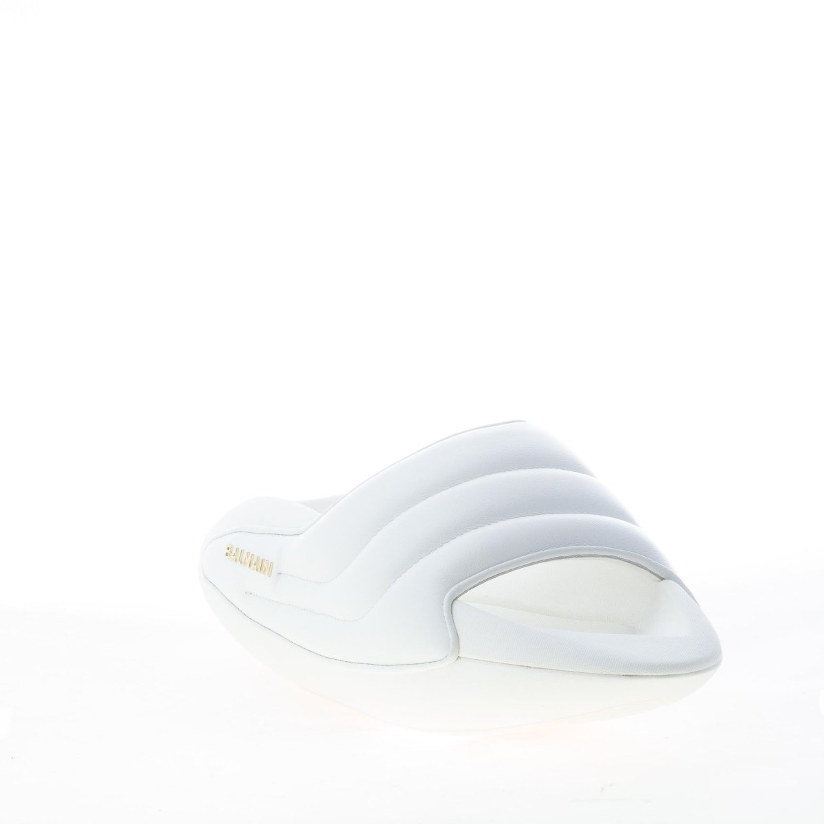 B-IT Puffy slide sandal made in white soft padded lambskin with quilted detailing.ย Gold tone metal brand logo at side. Thick platform EVA sole.
