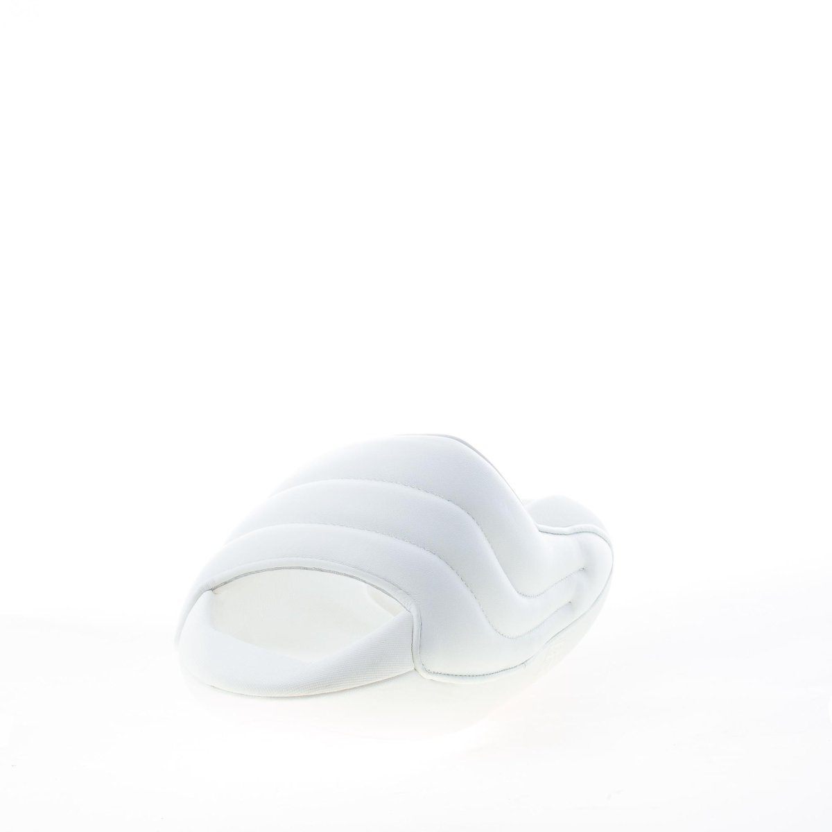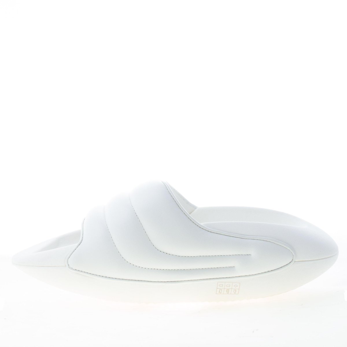 Sandalo slipper B-IT Puffy dal design futuristico, realizzato in pelle di agnello imbottita bianca a lavorazione trapuntata. Logo del brand in metallo dorato applicato a lato. Suola platform spessa in EVA.