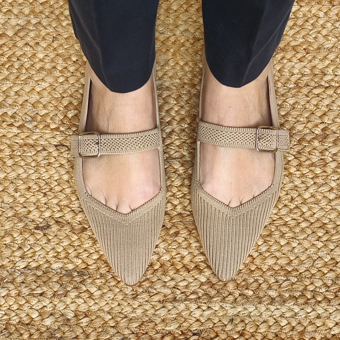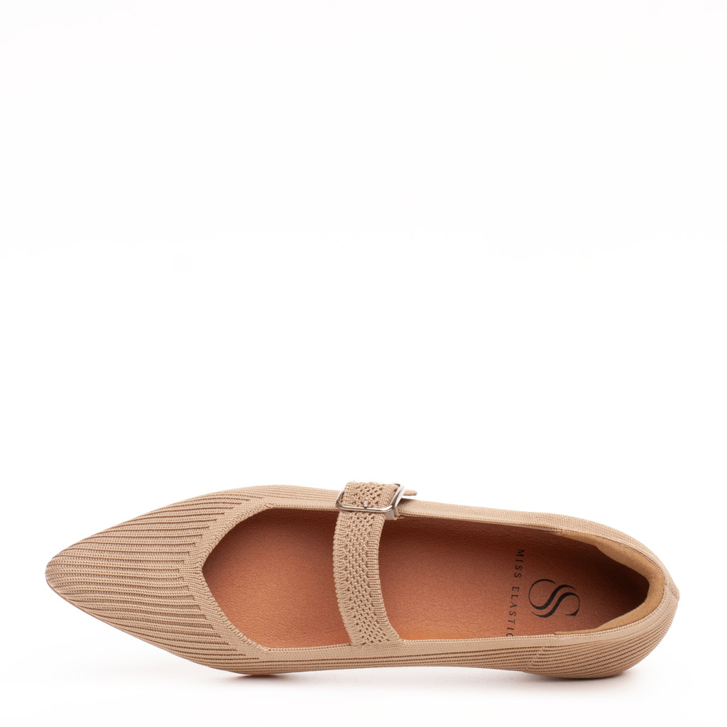 Scarpa bassa in tessuto eco-elastico camel ha la punta affusolata e la scollatura a V. Il cinturino sul collo del piede è regolabile. Soletta in tessuto antibatterico con micro zeppa sul tallone all’interno di 1.5 cm. Suola in gomma. Realizzato in Spagna.