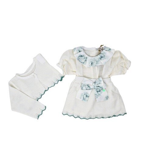 Completo neonata 3 pezzi in cotone Questo completo tre pezzi per neonata è un insieme coordinato ed elegante, caratterizzato da un raffinato motivo floreale e dettagli artigianali che richiamano uno stile classico e romantico. Descrizione degli Elementi Il set è composto dai seguenti capi coordinati: Abito/Gonnellina: Realizzato in una maglia di colore bianco panna , presenta una lavorazione a costine verticali. Il bordo inferiore è rifinito con un motivo a onde (festonato) profilato in un delicato verde . In vita è applicato un grande fiocco decorativo in tessuto bianco con una stampa di rose stilizzate nei toni del verde .…