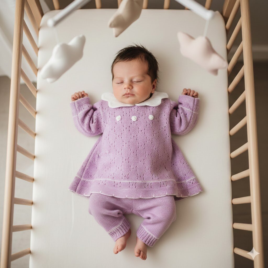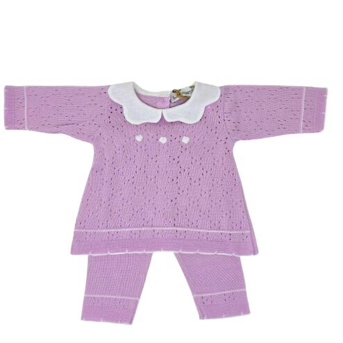 Questo raffinato completo a due pezzi in maglia di cotone lilla è la scelta perfetta per chi cerca un look romantico e curato nei minimi dettagli per la propria bambina. Dettagli di Design ed Eleganza Maglioncino a Trapezio: Il capo superiore presenta una linea svasata molto dolce, arricchita da un’elegante lavorazione traforata all-over che garantisce traspirabilità e stile. Colletto a Smerlo: Il colletto bianco a contrasto si distingue per il caratteristico bordo a smerlo (a onde), che dona un tocco di raffinatezza d’altri tempi. Applicazioni Floreali: Il corpetto è impreziosito da tre delicati fiorellini bianchi applicati centralmente, che richiamano il…