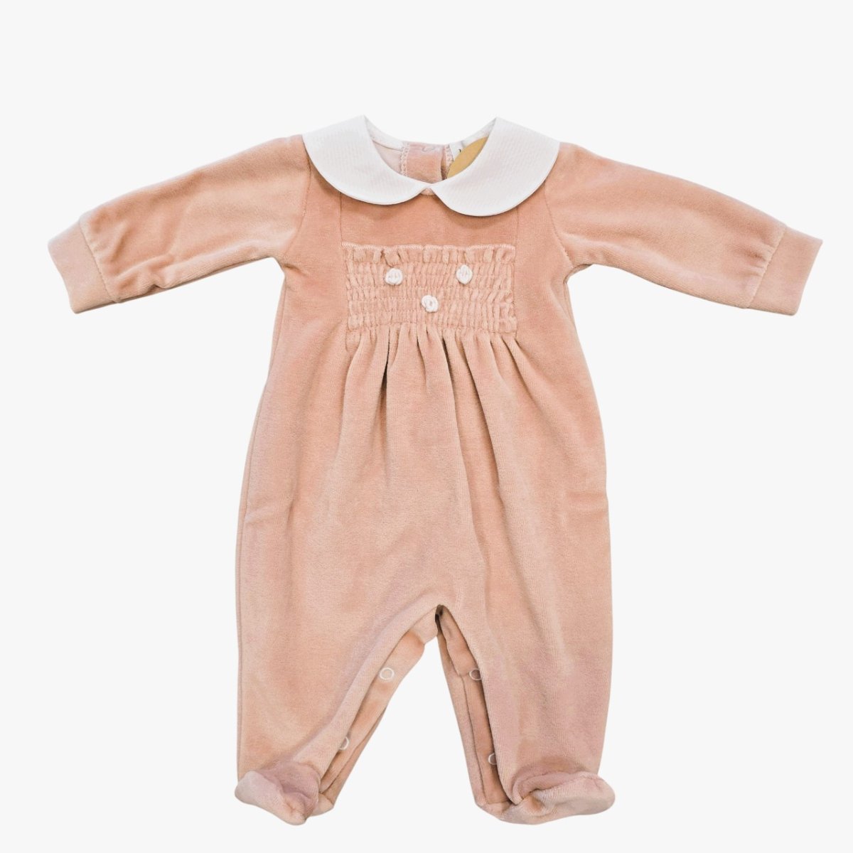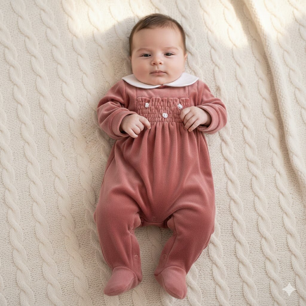 Questa tutina in ciniglia è un capo dolcissimo e raffinato, ideale per tenere al caldo il bebè con un tocco di eleganza senza tempo. Design e Dettagli Colore e Tessuto: Realizzata in una morbida ciniglia , la tutina offre una texture vellutata e confortevole. Lavorazione a Punto Smock: Il corpetto è impreziosito da una classica balza arricciata (punto smock) con piccoli ricami bianchi a contrasto, che dona volume e un aspetto artigianale. Colletto: Un delicato colletto “Peter Pan” bianco rifinisce lo scollo, aggiungendo una nota di candore e stile tradizionale. Piedini Integrati: Il modello è intero con piedini chiusi, garantendo…