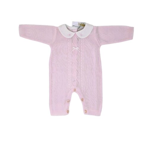 Questa dolcissima tutina intera in maglia di cotone rosa è un capo raffinato e delicato, perfetto per accogliere una neonata con uno stile classico e senza tempo. Dettagli di Design ed Eleganza Colore Rosa Pastello: Una tonalità tenue e romantica, ideale per i primi mesi di vita. Colletto Peter Pan: Realizzato in tessuto bianco a contrasto, il colletto presenta delicati ricami floreali rosati che aggiungono un tocco di estrema raffinatezza. Lavorazione Centrale a Rilievo: Il busto è impreziosito da una lavorazione a maglia con motivi a rombi traforati e treccine verticali, arricchita da un piccolo fiocchetto bianco applicato centralmente. Comfort…