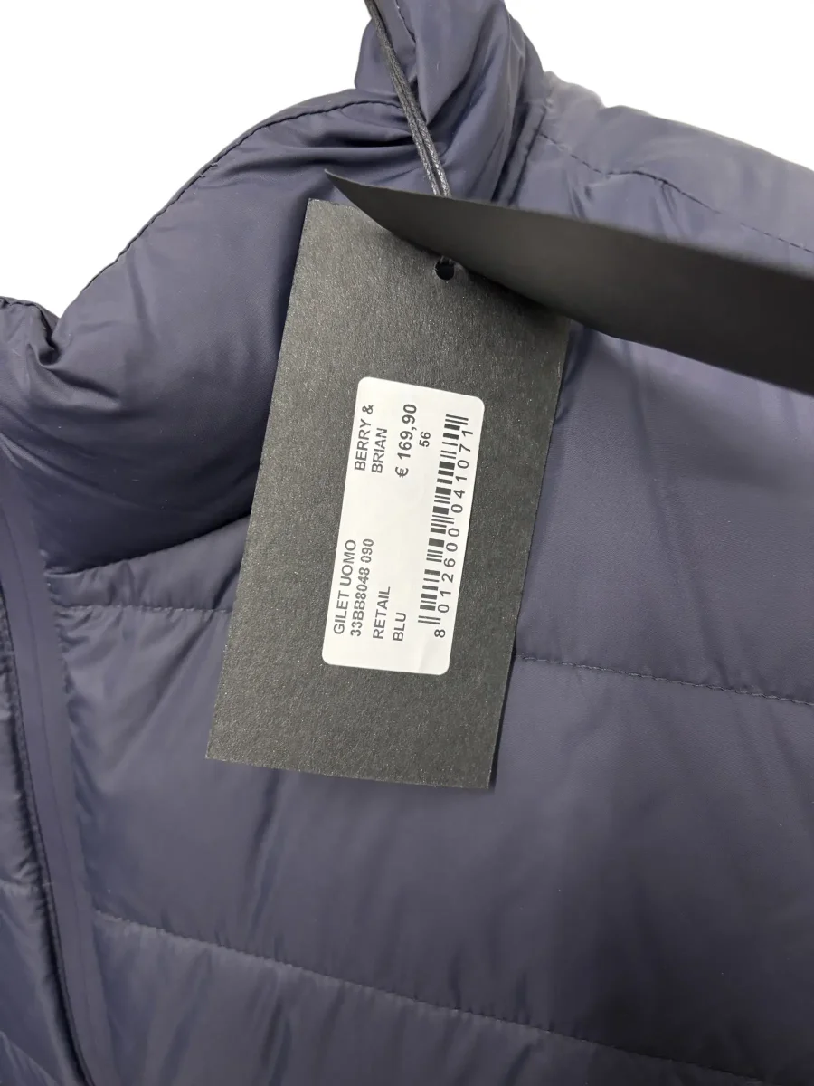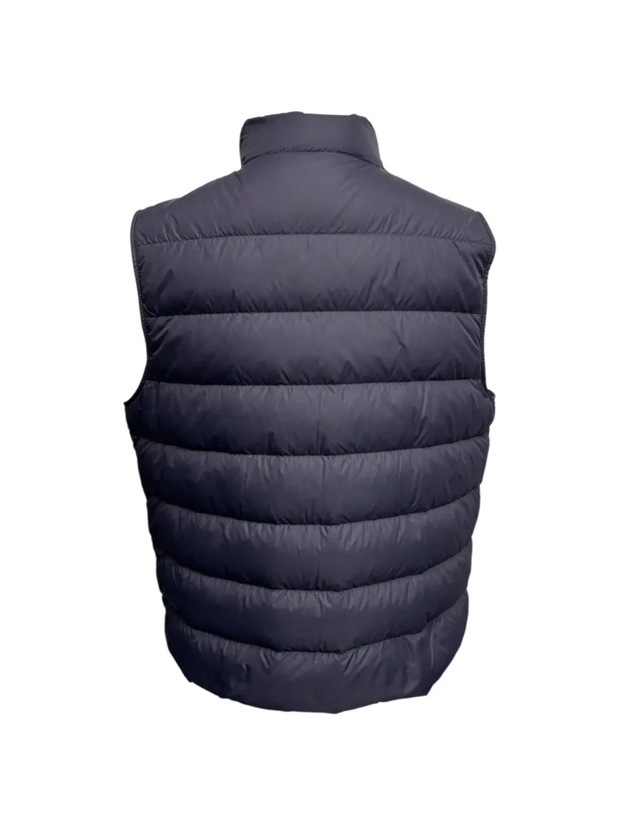 Gilet con trapuntatura orizzontale e collo alto protettivo. Chiusura frontale con zip integrale a doppio cursore idrorepellente. Due tasche laterali a filo con bottone a pressione e tasche interne con chiusura a zip.
