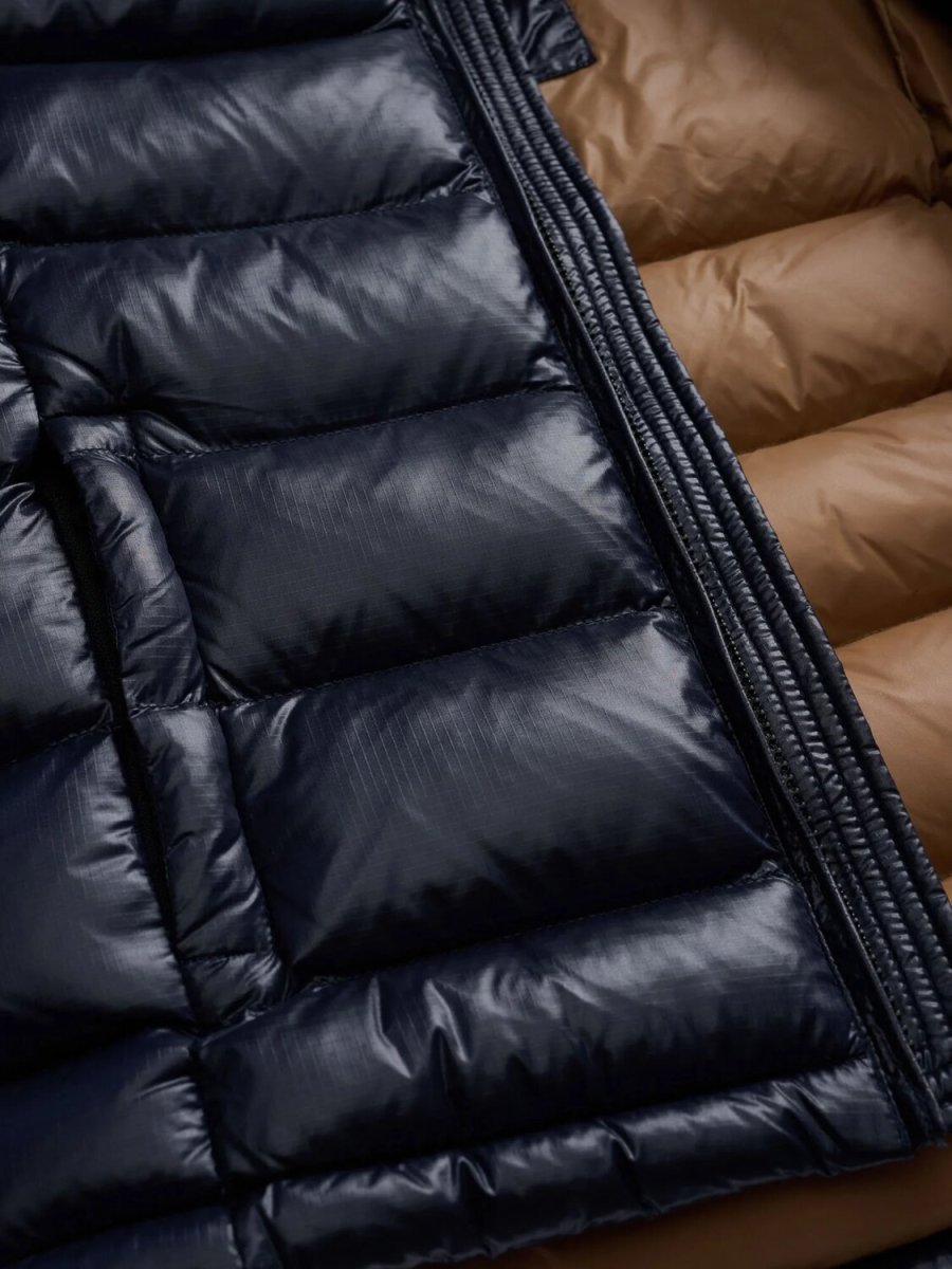 Piumino bambino trapuntato a righe orizzontali. Capo iconico Blauer con imbottitura ovatta. Cappuccio fisso Realizzato in nylon Foderato in nylon contrasto colore Imbottito ovatta Sorona® Aura Chiusura con zip nascosta Tasche con zip nascosta Tasche interne con velcro Patch e passante con logo